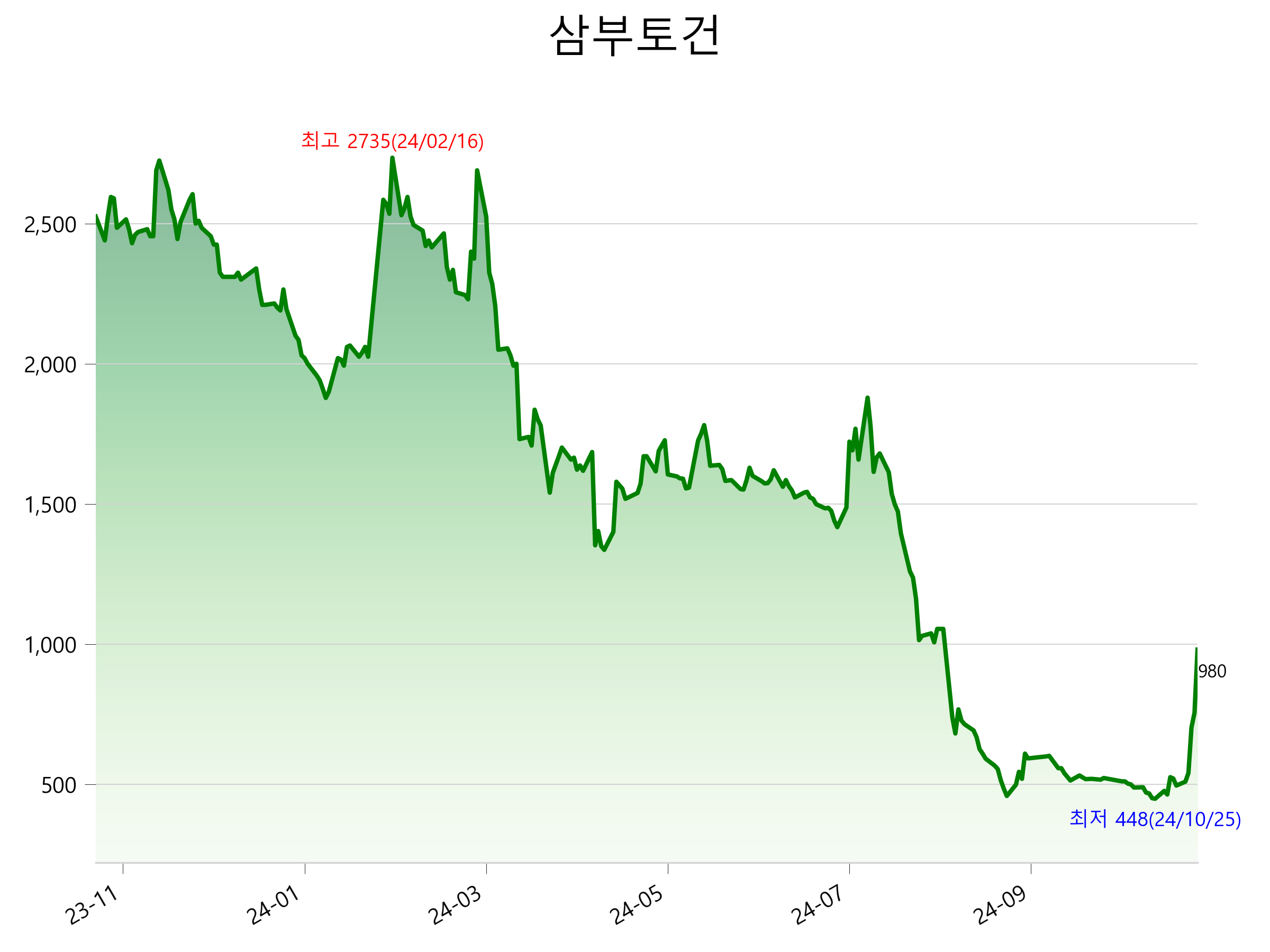 52주 최고가는 2,735원(2024-02-16), 52주 최저가는 448원(2024-10-25)으로 52주간 주가 상승률은 -61.2% 입니다.