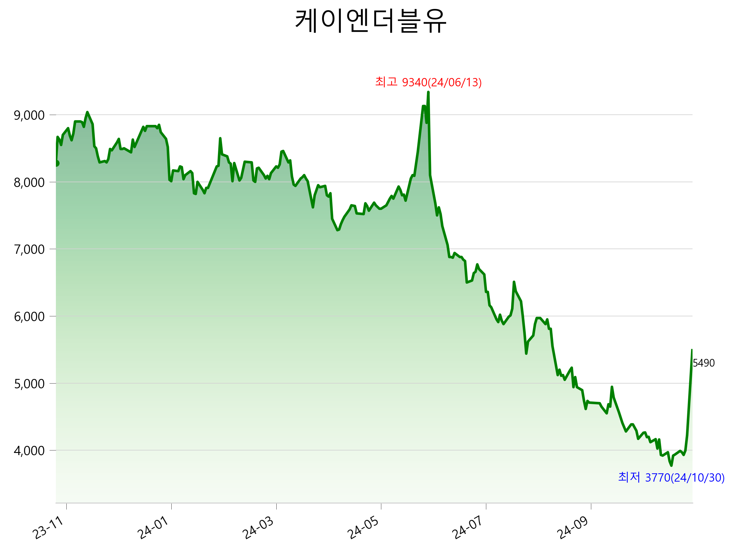 11월 11일 기준 주가는 5,490원 입니다. 아래는 최근 1년간의 주가흐름입니다.