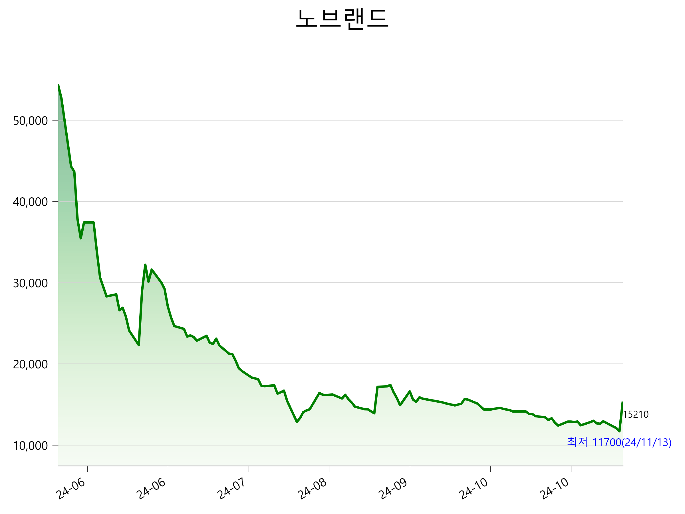 52주 최고가는 54,300원(2024-05-23), 52주 최저가는 11,700원(2024-11-13)으로 52주간 주가 상승률은 -72.0% 입니다.