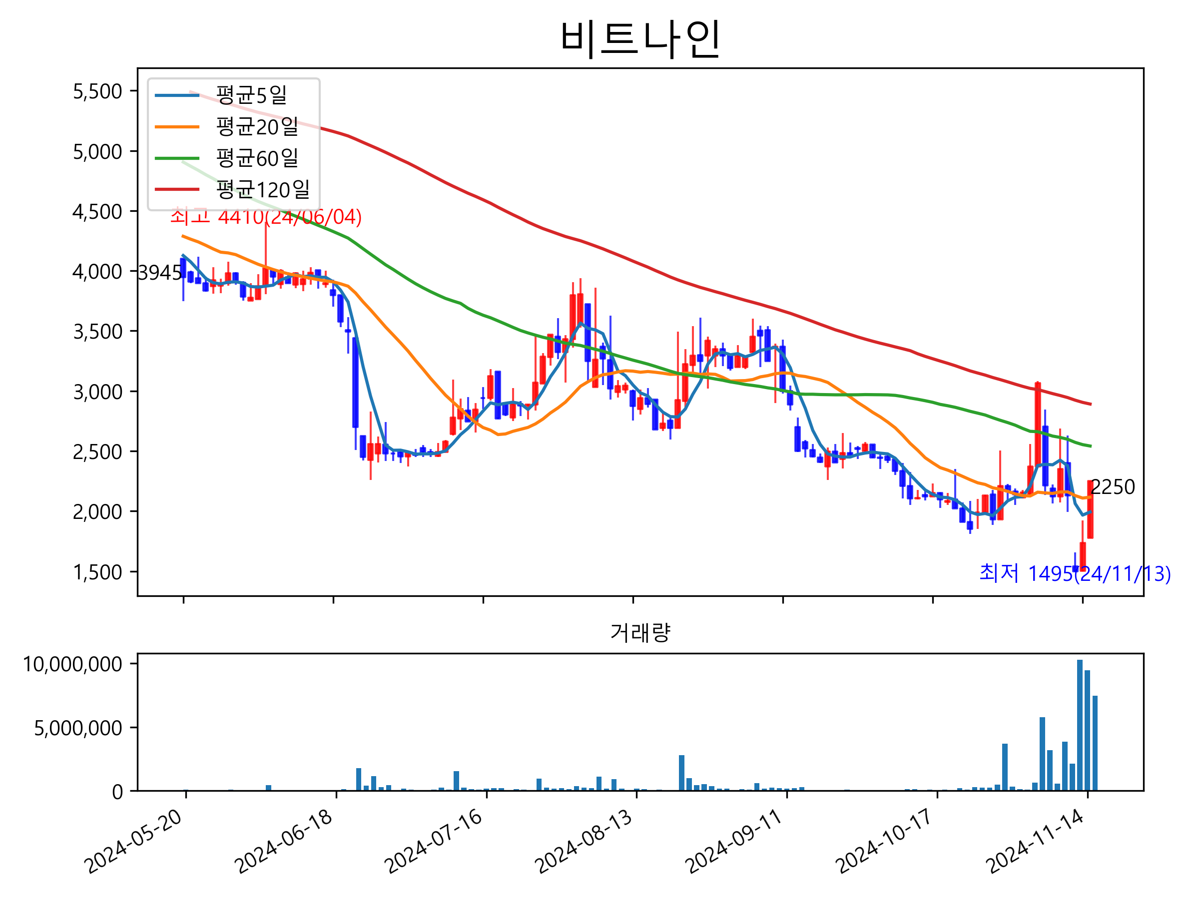 11월 15일 기준 주가는 2,250원 입니다. 아래는 최근 1년간의 주가흐름입니다.
