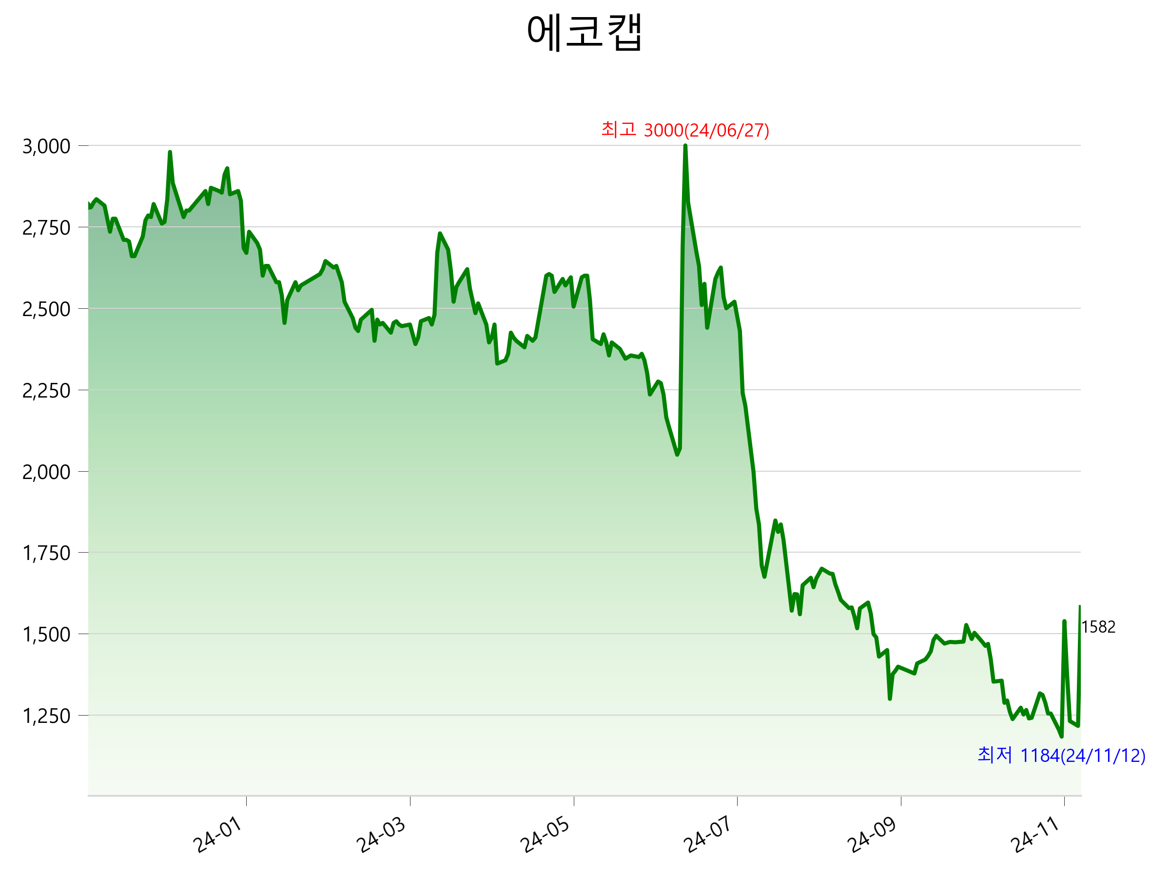 52주 최고가는 3,000원(2024-06-27), 52주 최저가는 1,184원(2024-11-12)으로 52주간 주가 상승률은 -43.9% 입니다.