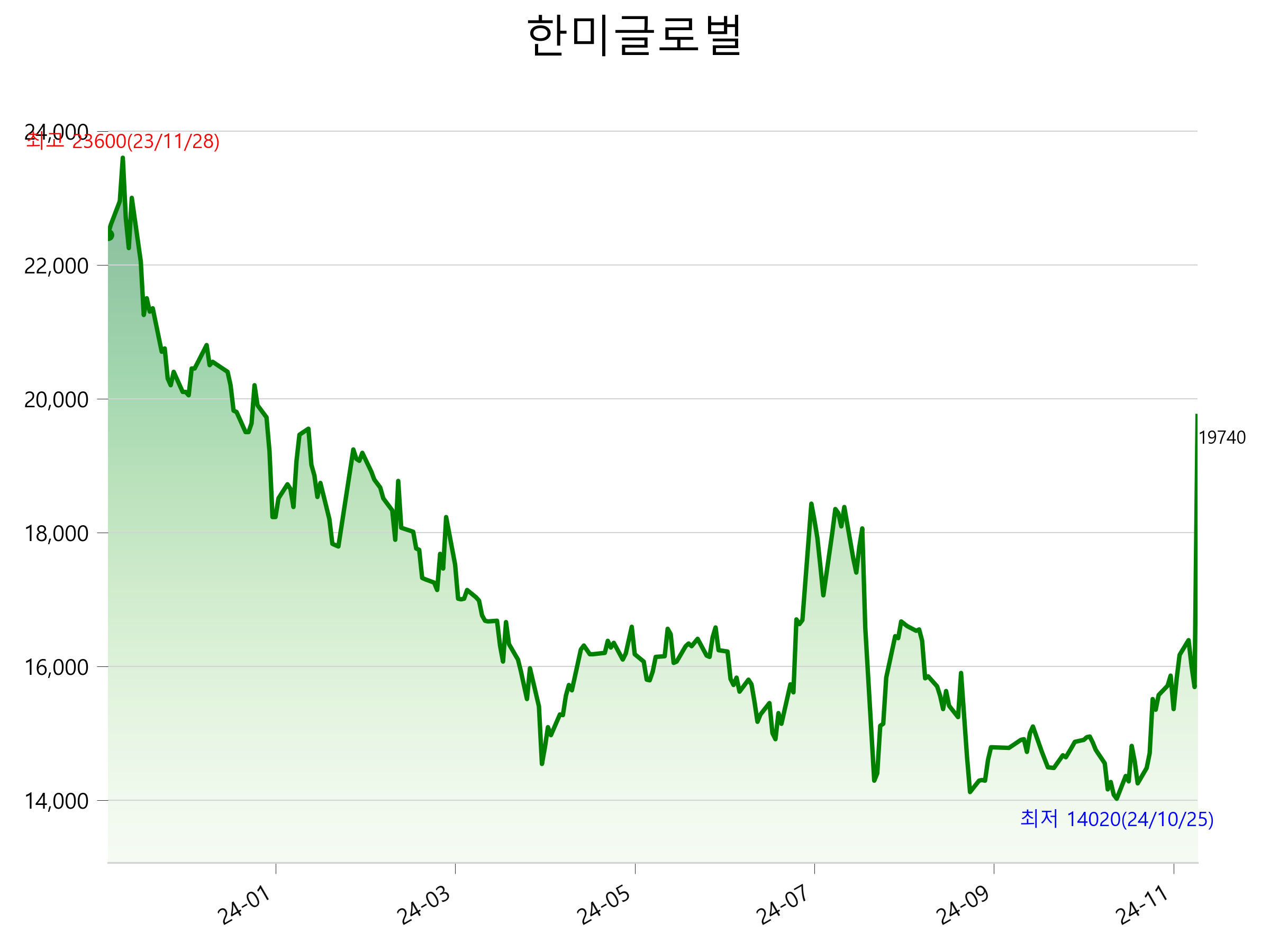 11월 21일 기준 주가는 19,740원 입니다. 아래는 최근 1년간의 주가흐름입니다.