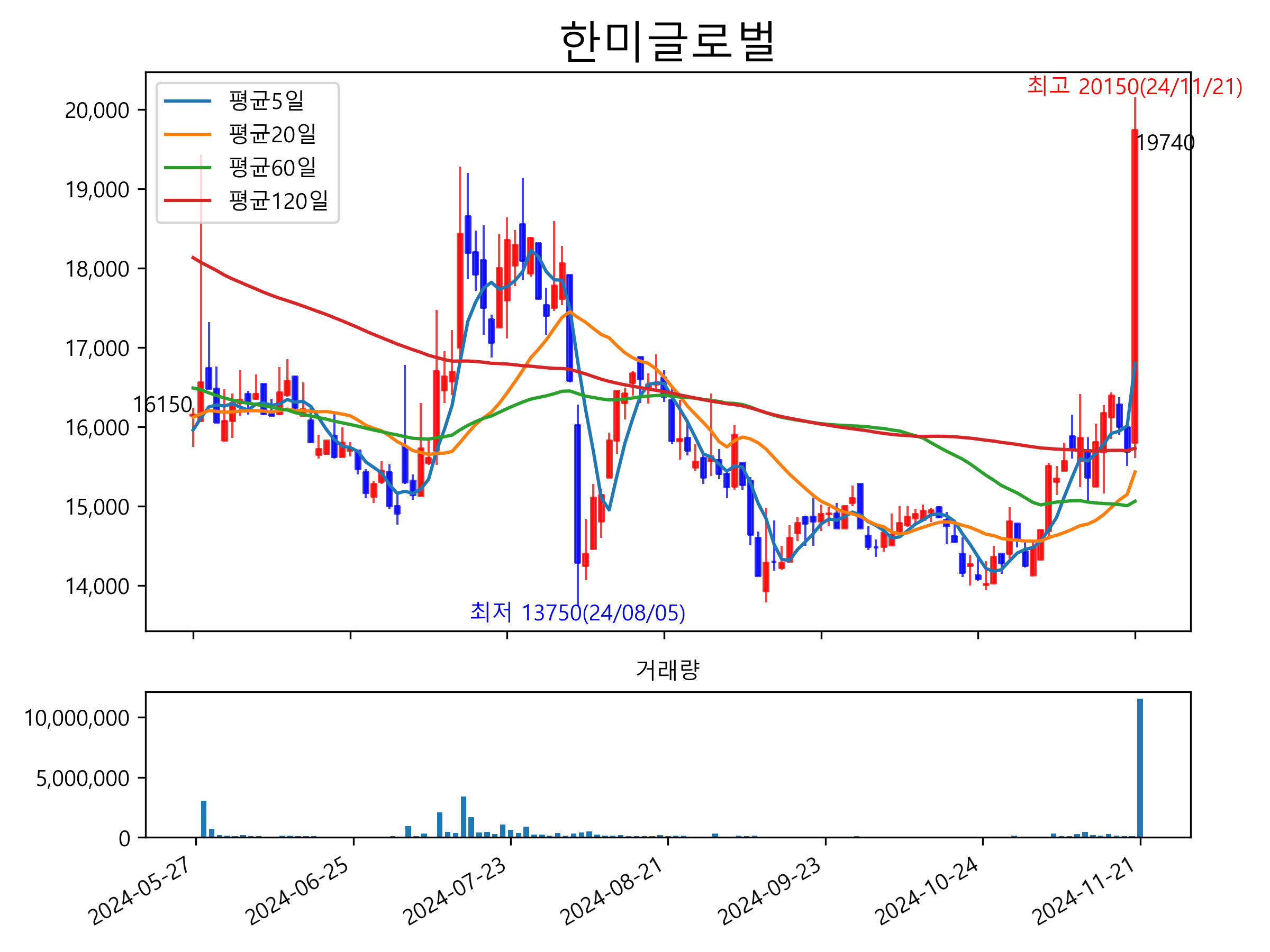 최근 6개월간 캔들차트 및 이동평균선입니다.
