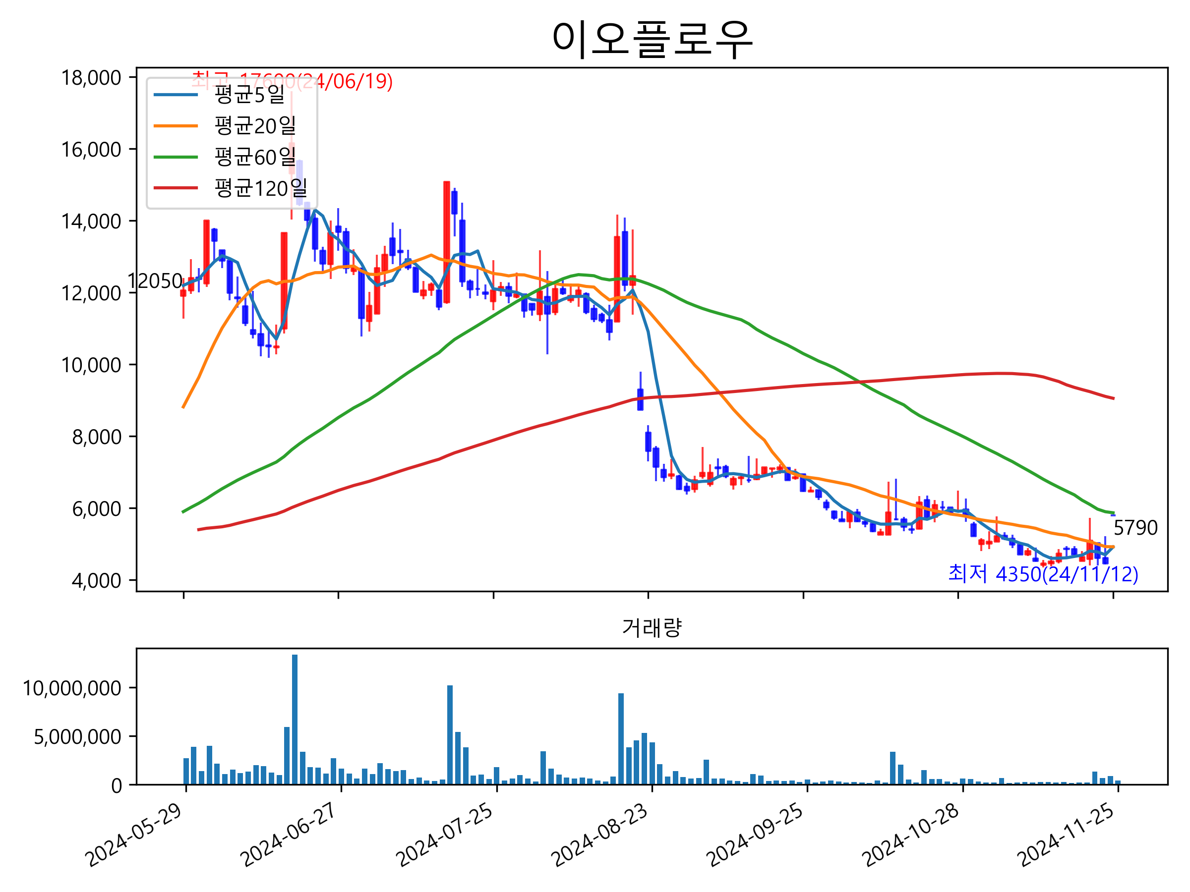최근 6개월간 캔들차트 및 이동평균선입니다.