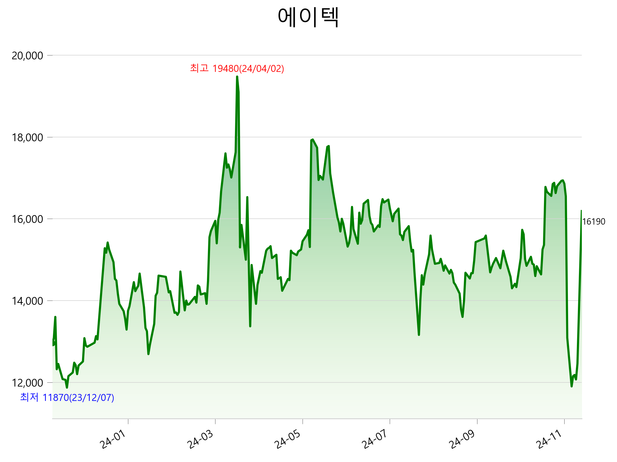 11월 25일 기준 주가는 16,190원 입니다. 아래는 최근 1년간의 주가흐름입니다.
