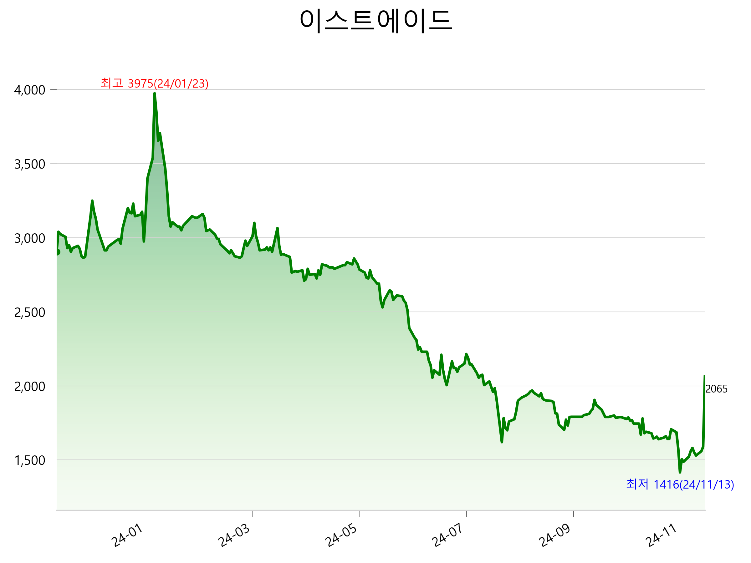 52주 최고가는 3,975원(2024-01-23), 52주 최저가는 1,416원(2024-11-13)으로 52주간 주가 상승률은 -28.9% 입니다.