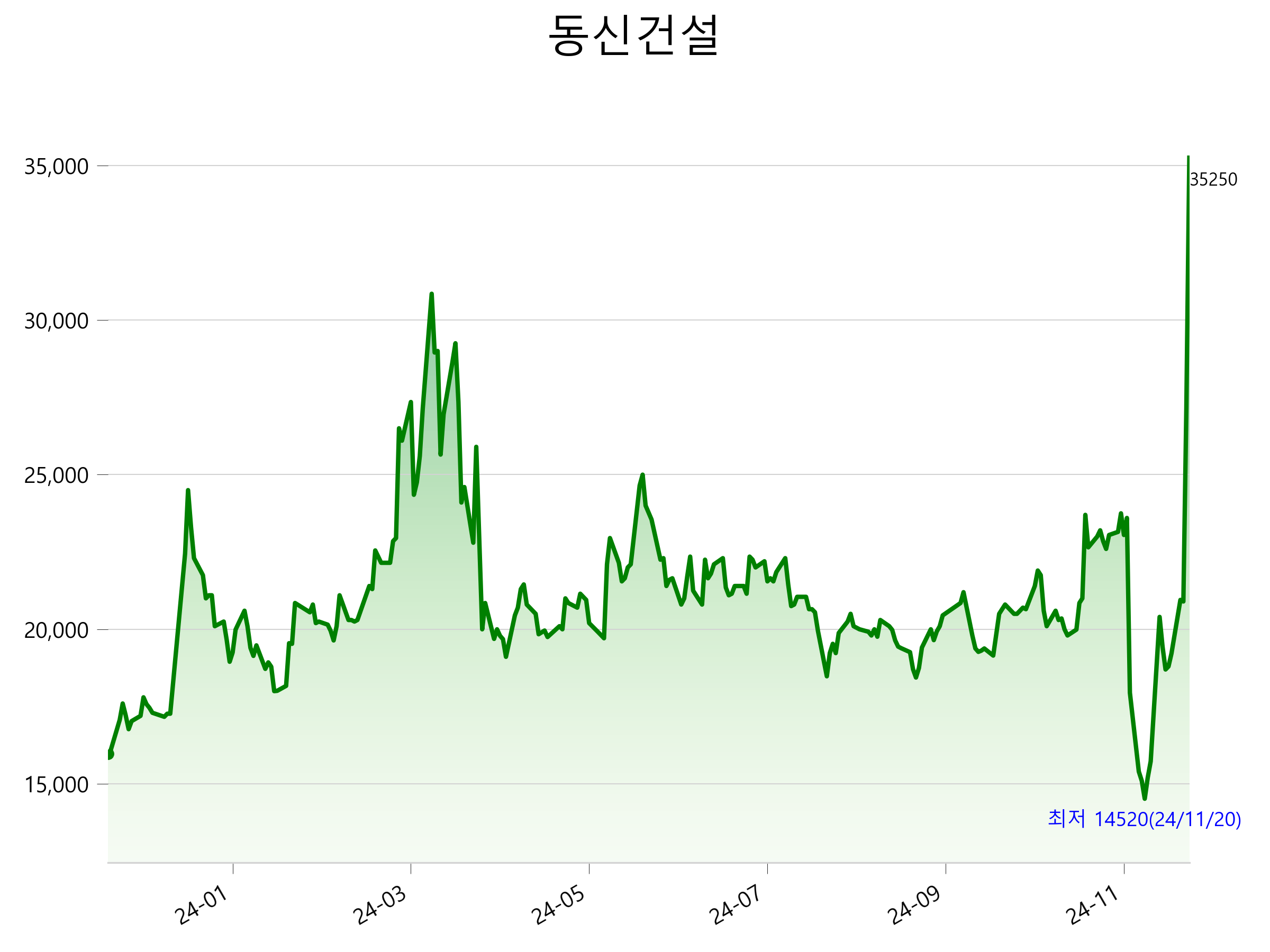 12월 5일 기준 주가는 35,250원 입니다. 아래는 최근 1년간의 주가흐름입니다.