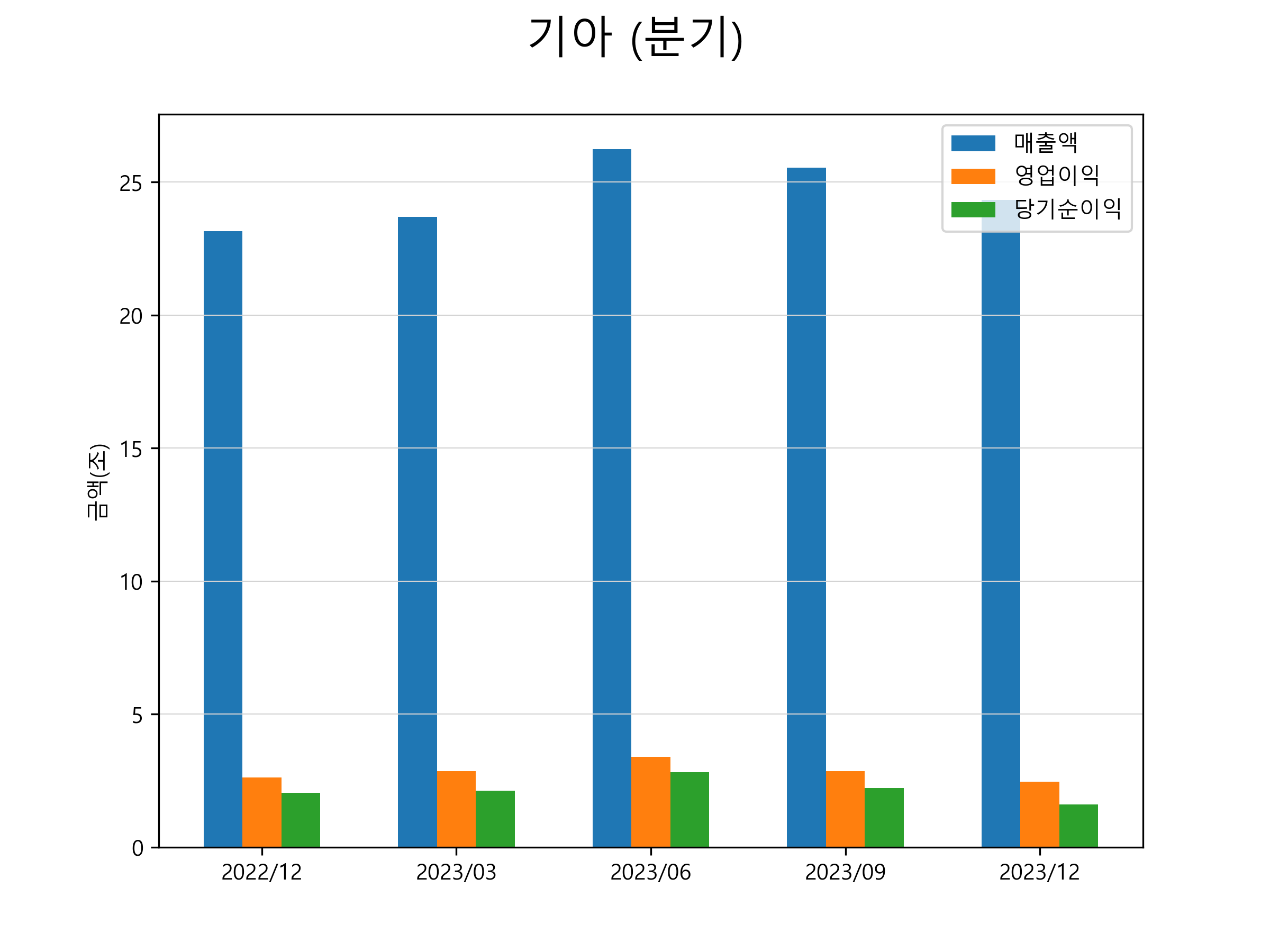 기아의 2023년 4분기 매출은 24조 3282억원, 영업이익 2조 4658억원, 당기순이익 1조 6201억원을 기록했습니다. 분기별 매출 및 영업이익, 당기순이익 표입니다.