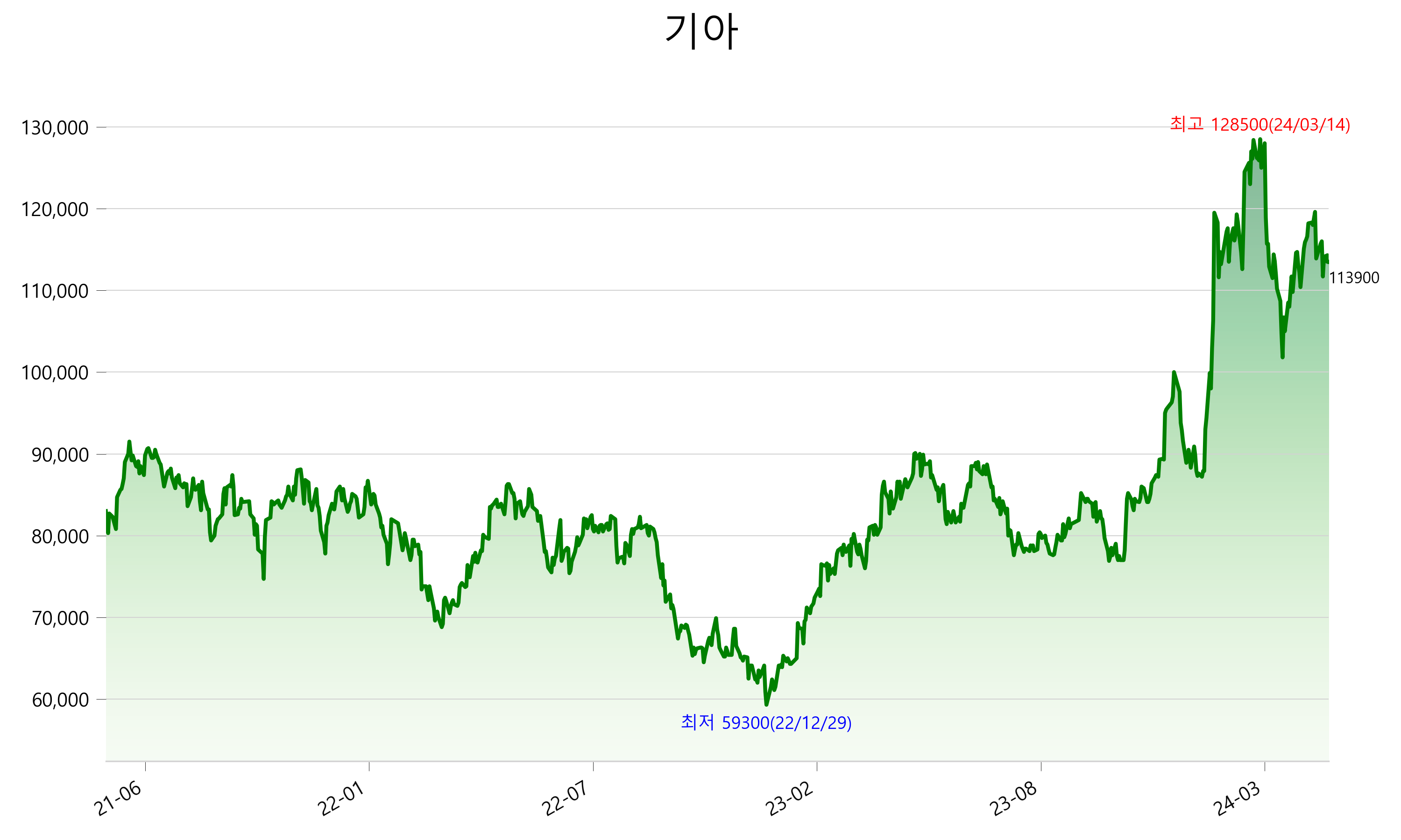 52주 최고가는 128,500원(2024-03-14), 52주 최저가는 76,900원(2023-10-31)으로 52주간 변동률은 26.7% 입니다.