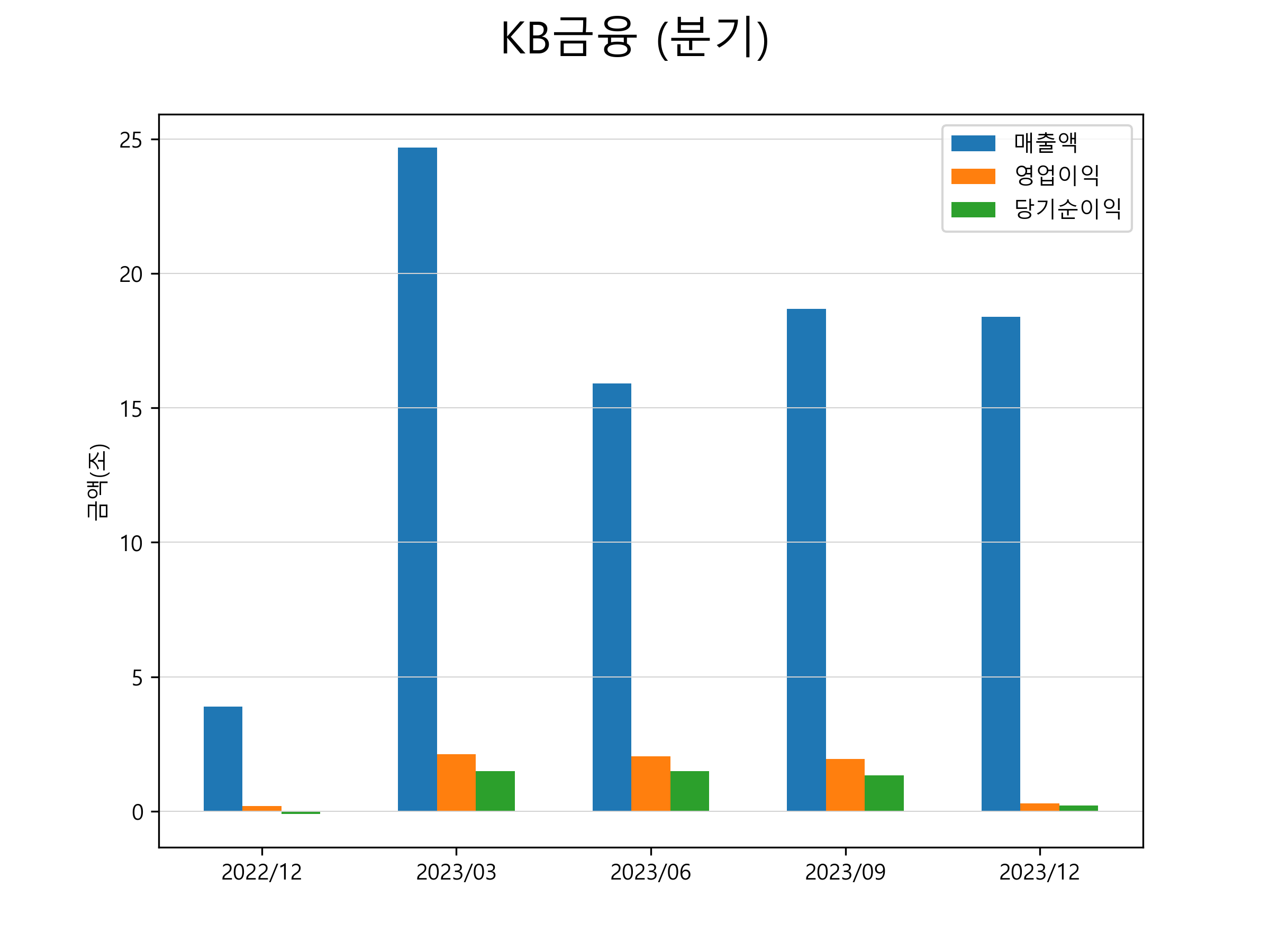KB금융의 2023년 4분기 매출은 18조 3846억원, 영업이익 3042억원, 당기순이익 2175억원을 기록했습니다. 분기별 매출 및 영업이익, 당기순이익 표입니다.