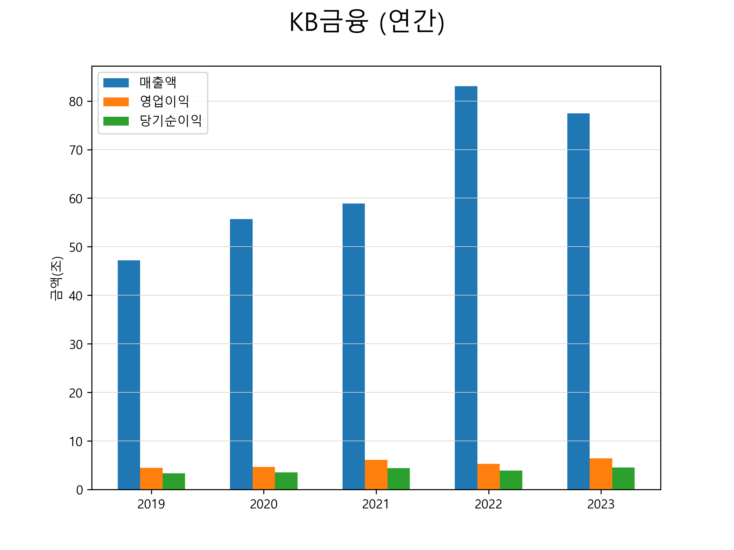 KB금융의 최근 5년간 실적입니다. 2023년 매출은 77조 4828억원, 영업이익 6조 4353억원, 당기순이익 4조 5634억원을 기록했습니다. 연간 매출 및 영업이익, 당기순이익 표입니다.