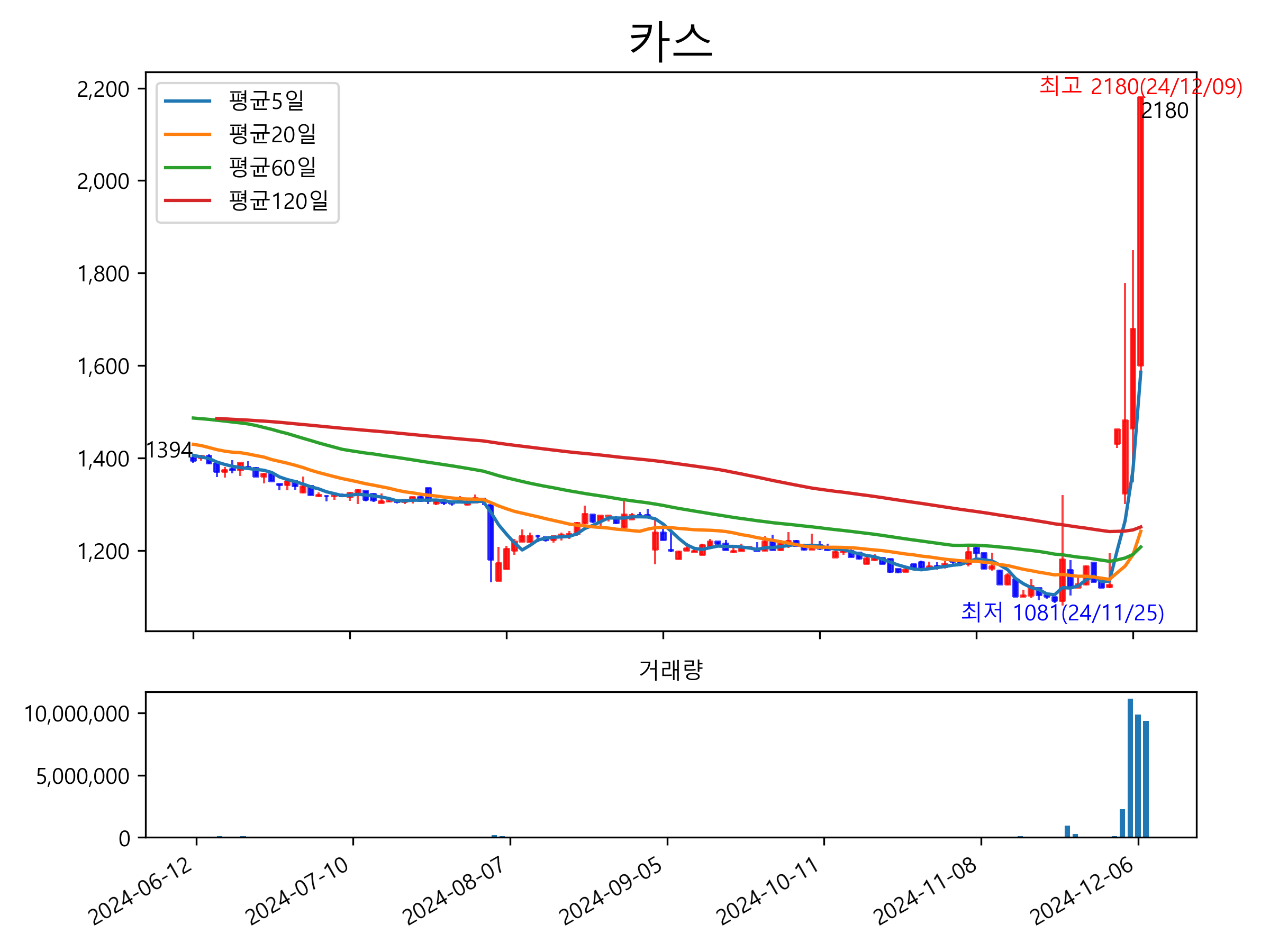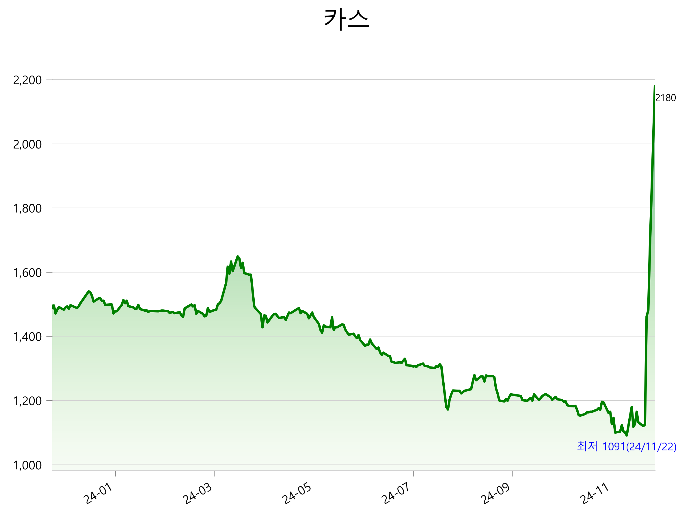 52주 최고가는 2,180원(2024-12-09), 52주 최저가는 1,091원(2024-11-22)으로 52주간 주가 상승률은 45.8% 입니다.