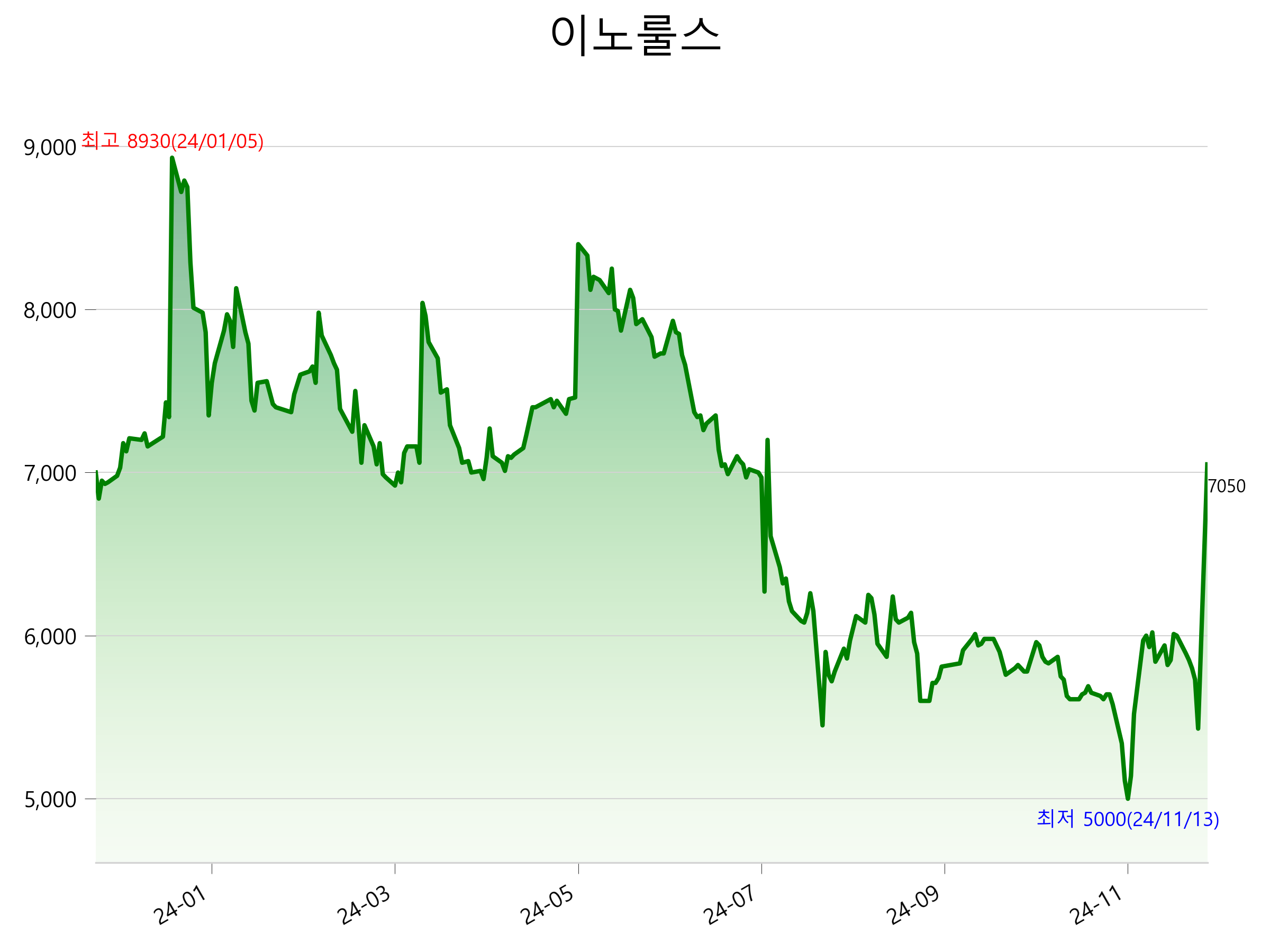 12월 9일 기준 주가는 7,050원 입니다. 아래는 최근 1년간의 주가흐름입니다.