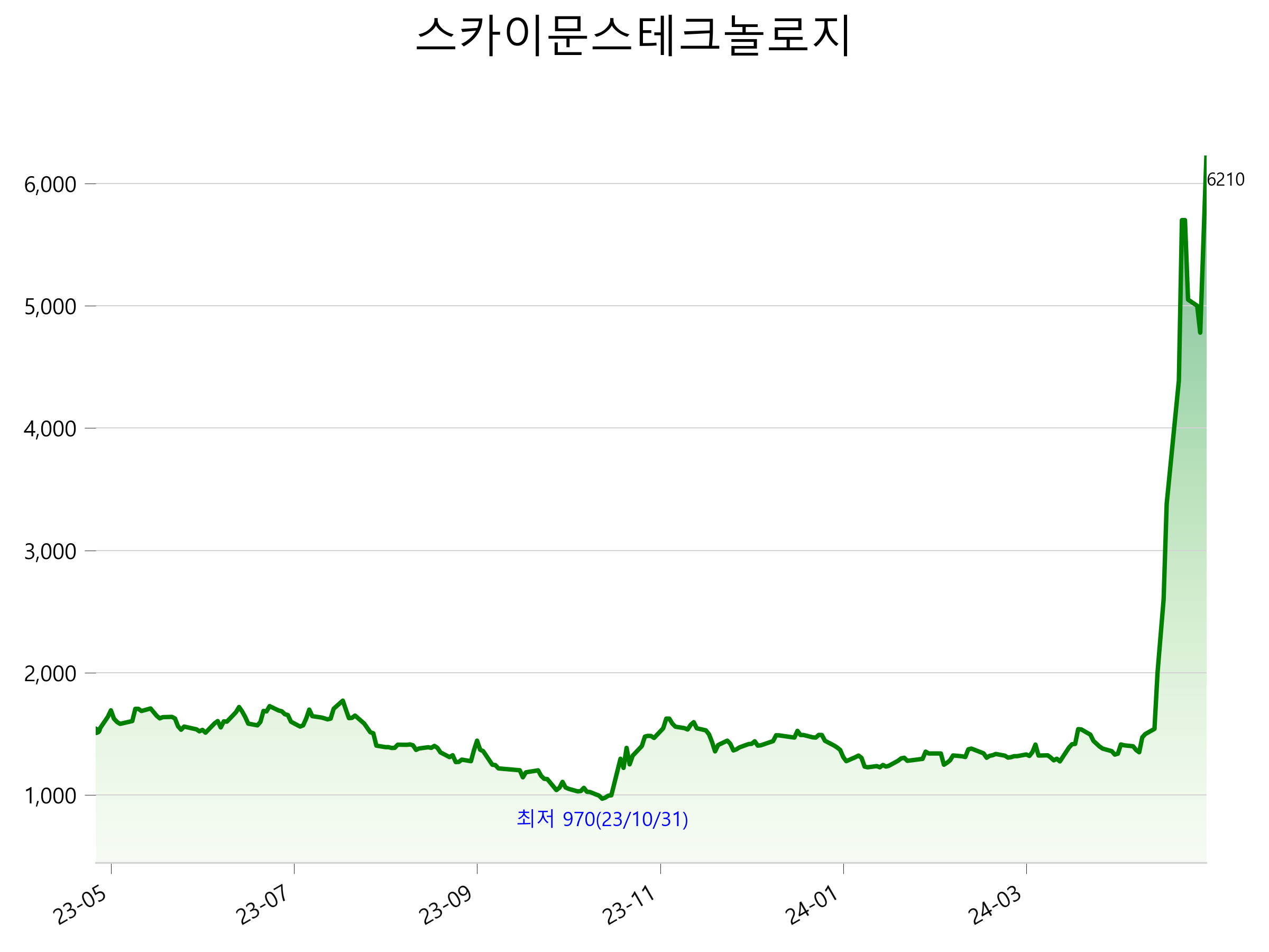 52주 최고가는 6,210원(2024-05-16), 52주 최저가는 970원(2023-10-31)으로 52주간 주가 상승률은 302.5% 입니다.