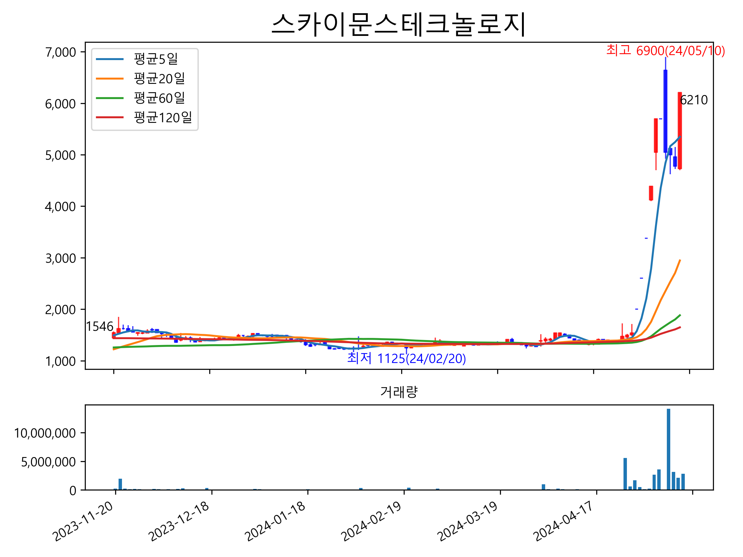 최근 6개월간 캔들차트 및 이동평균선입니다.