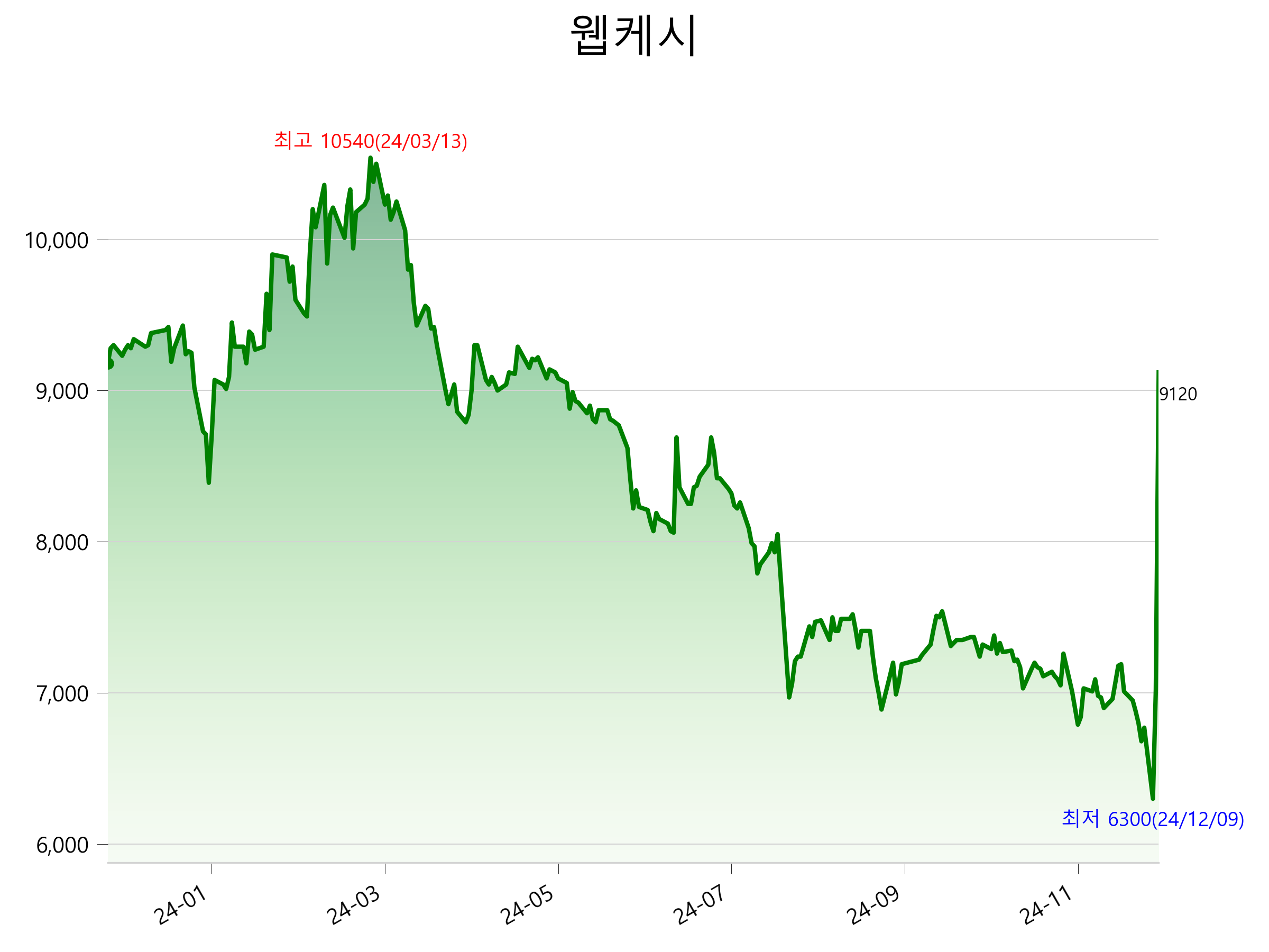 12월 11일 기준 주가는 9,120원 입니다. 아래는 최근 1년간의 주가흐름입니다.