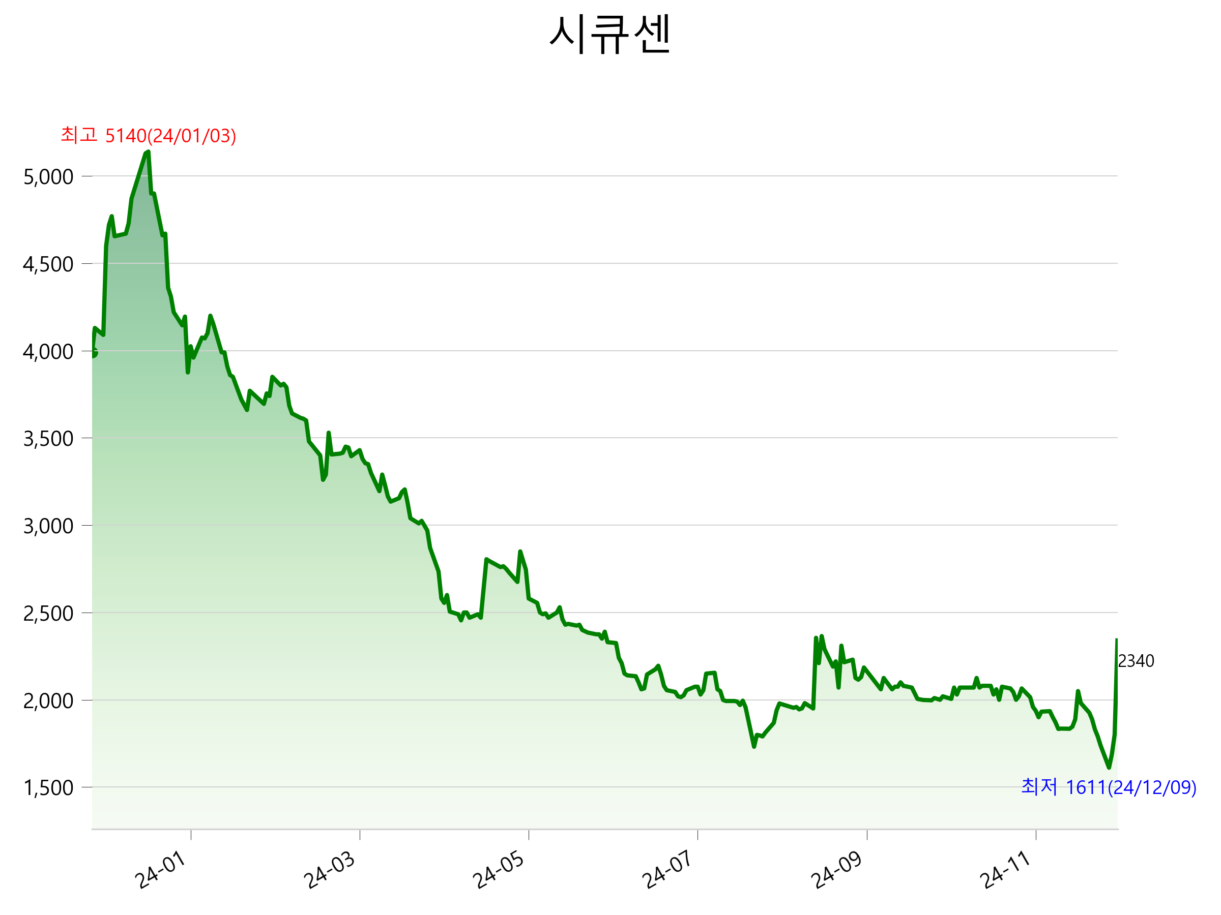 52주 최고가는 5,140원(2024-01-03), 52주 최저가는 1,611원(2024-12-09)으로 52주간 주가 상승률은 -41.4% 입니다.