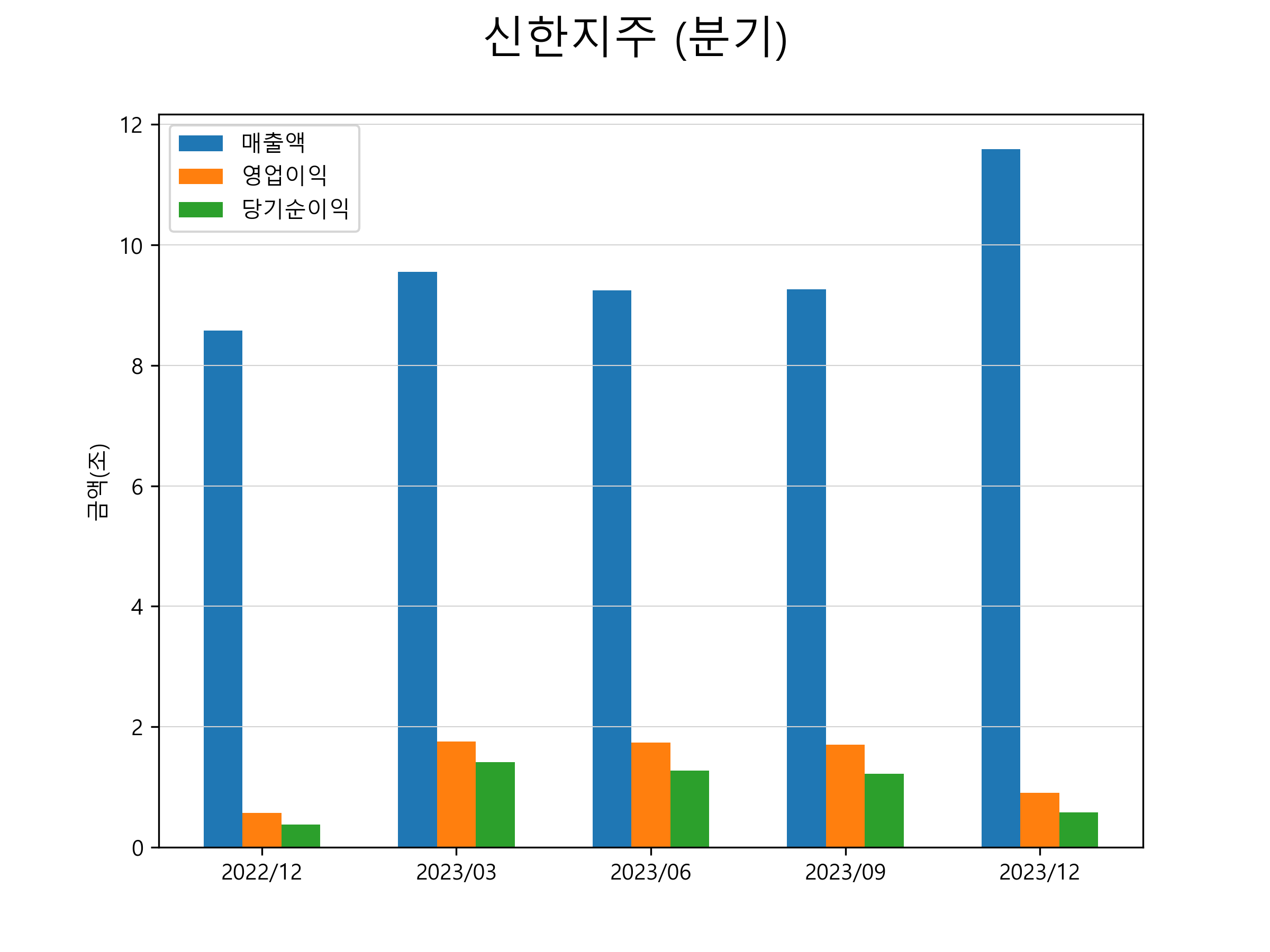 신한지주의 2023년 4분기 매출은 11조 5924억원, 영업이익 9045억원, 당기순이익 5761억원을 기록했습니다. 분기별 매출 및 영업이익, 당기순이익 표입니다.