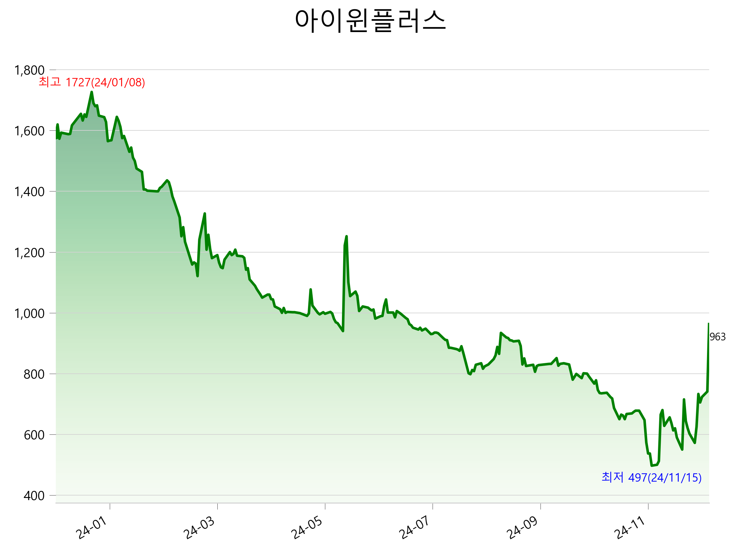 12월 17일 기준 주가는 963원 입니다. 아래는 최근 1년간의 주가흐름입니다.