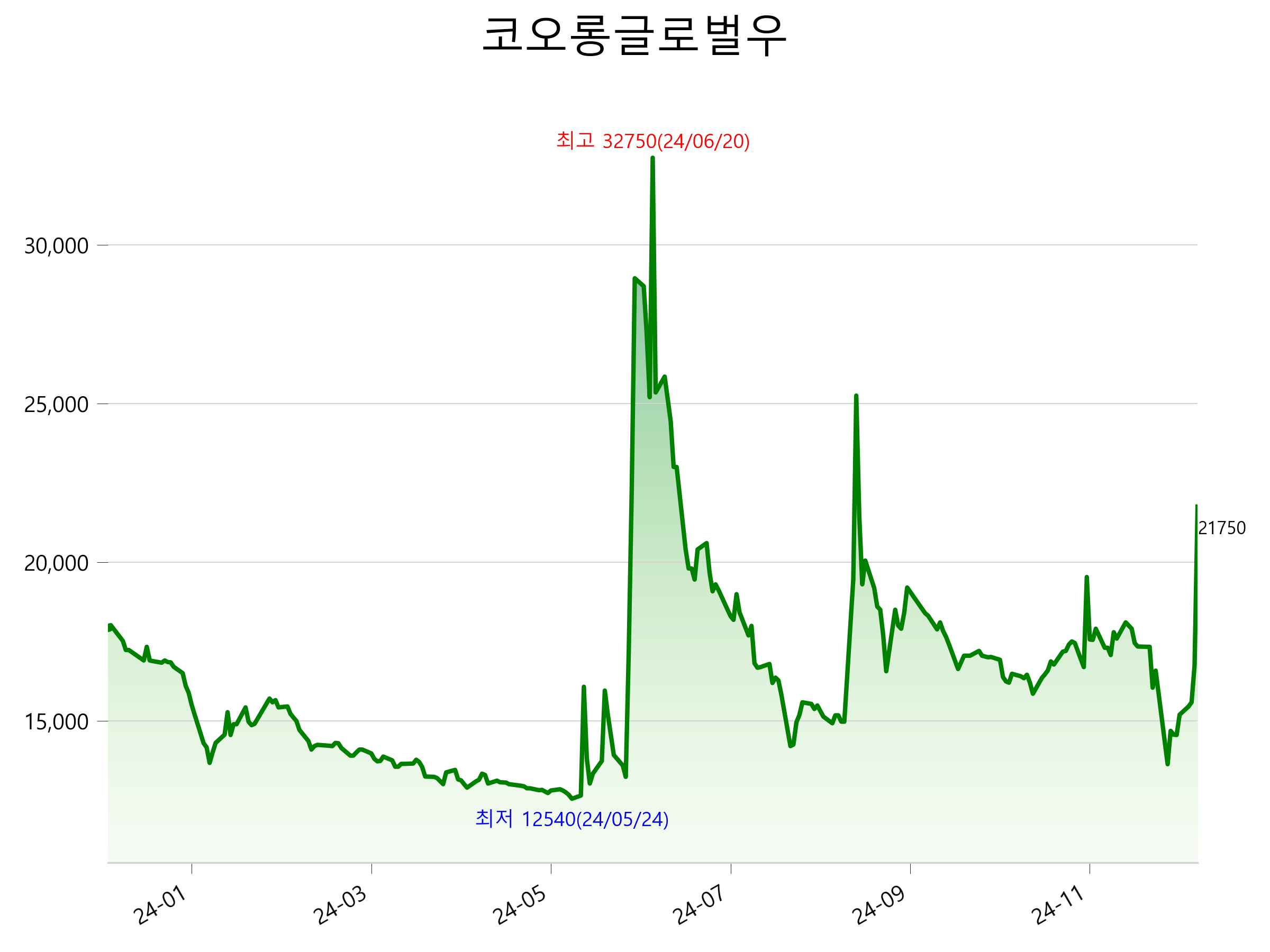 52주 최고가는 32,750원(2024-06-20), 52주 최저가는 12,540원(2024-05-24)으로 52주간 주가 상승률은 20.9% 입니다.