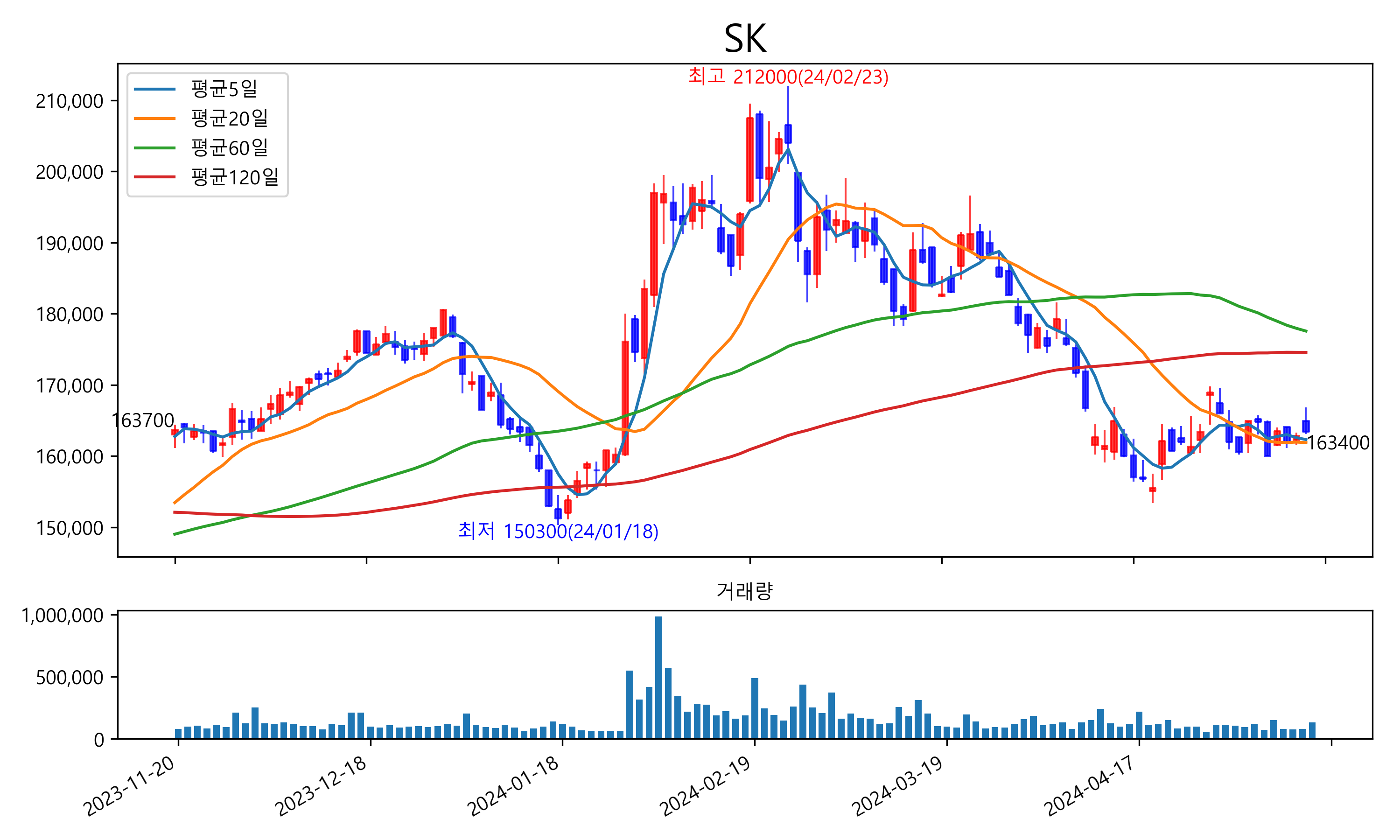 최근 6개월간 캔들차트 및 이동평균선입니다.