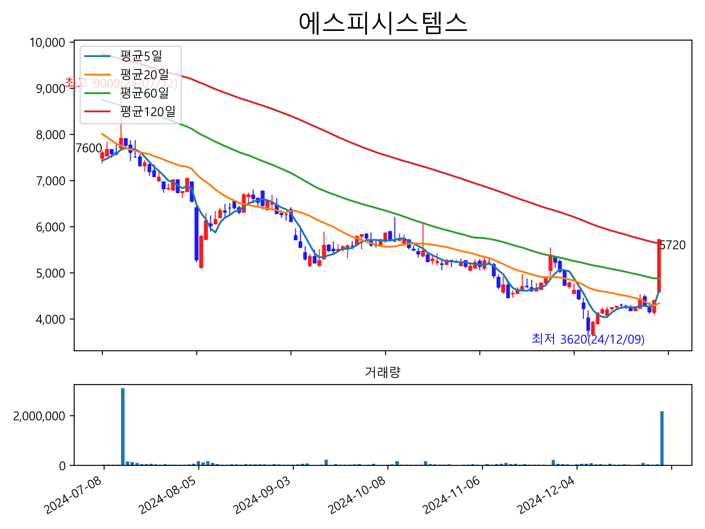 최근 6개월간 캔들차트 및 이동평균선입니다.