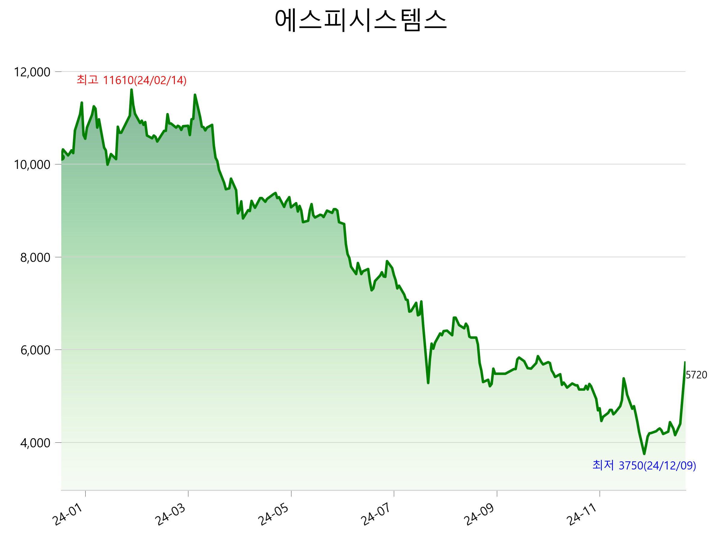 52주 최고가는 11,610원(2024-02-14), 52주 최저가는 3,750원(2024-12-09)으로 52주간 주가 상승률은 -43.6% 입니다.