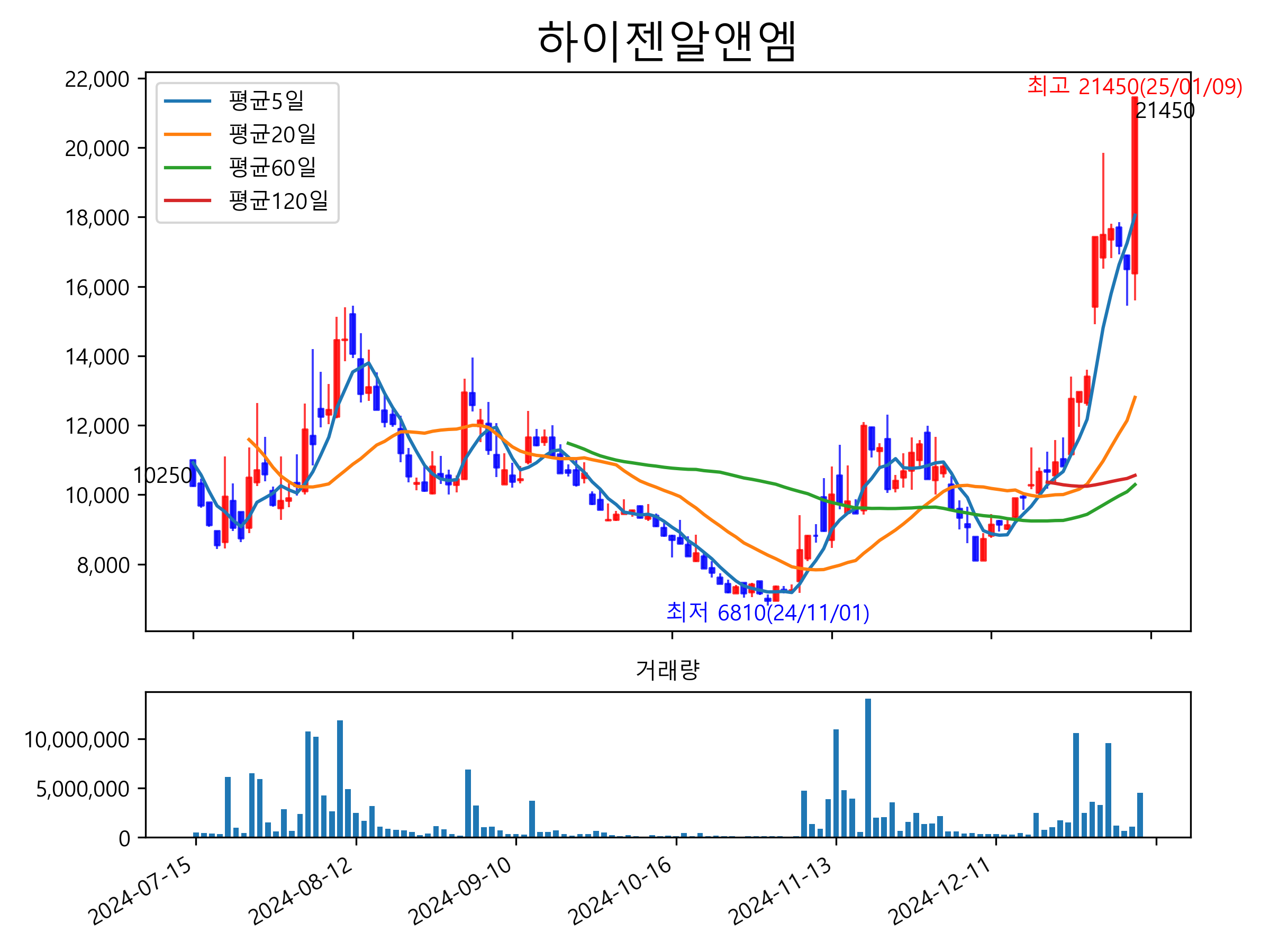 최근 6개월간 캔들차트 및 이동평균선입니다.