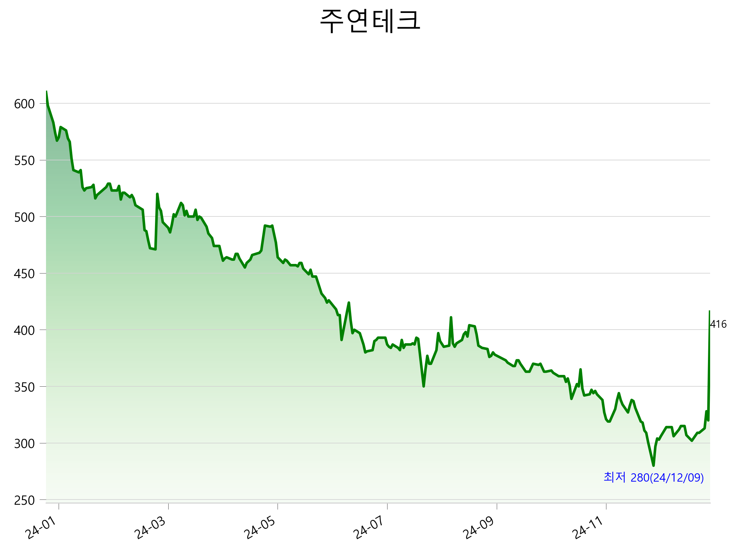 1월 9일 기준 주가는 416원 입니다. 아래는 최근 1년간의 주가흐름입니다.