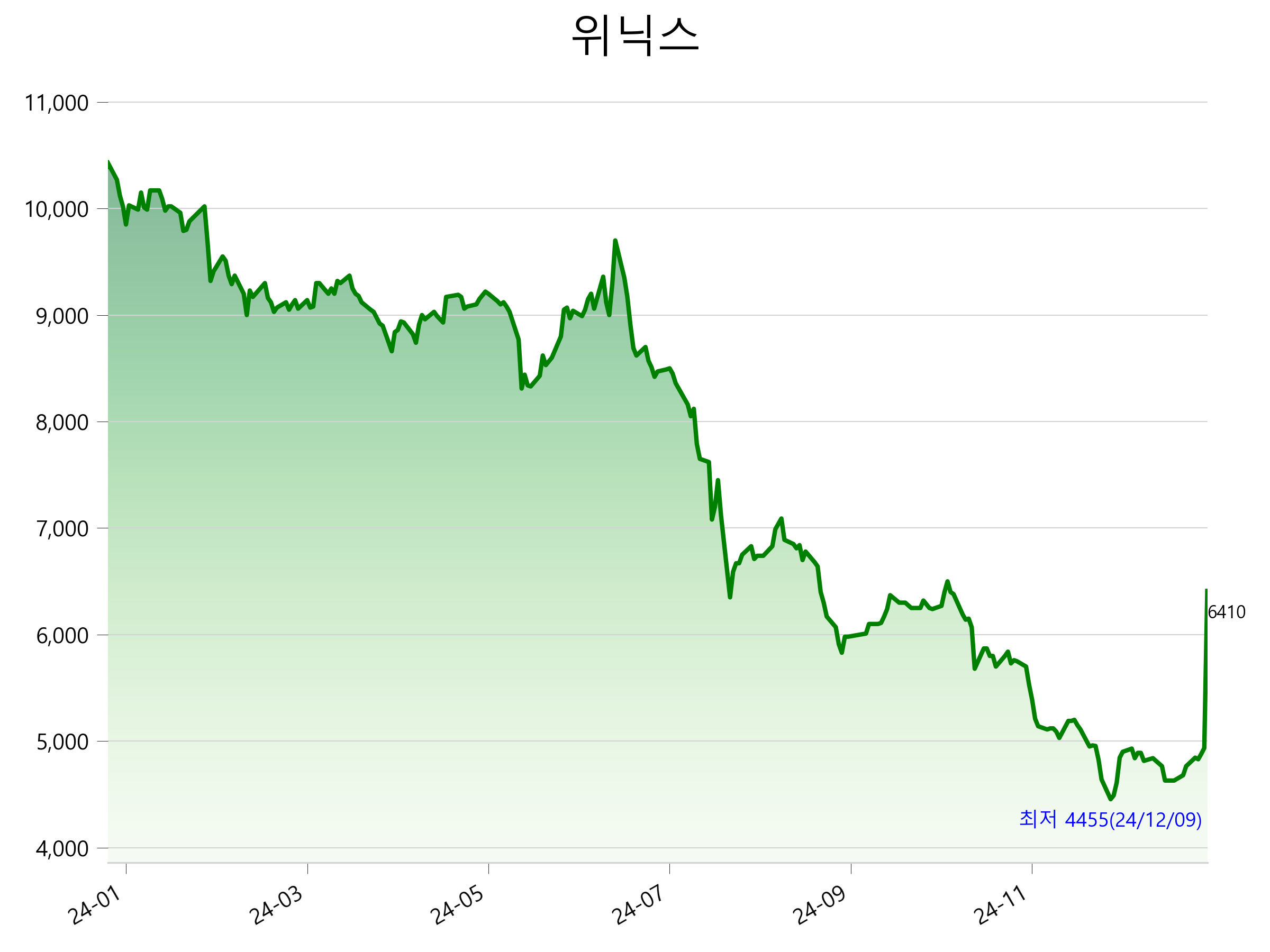 1월 10일 기준 주가는 6,410원 입니다. 아래는 최근 1년간의 주가흐름입니다.