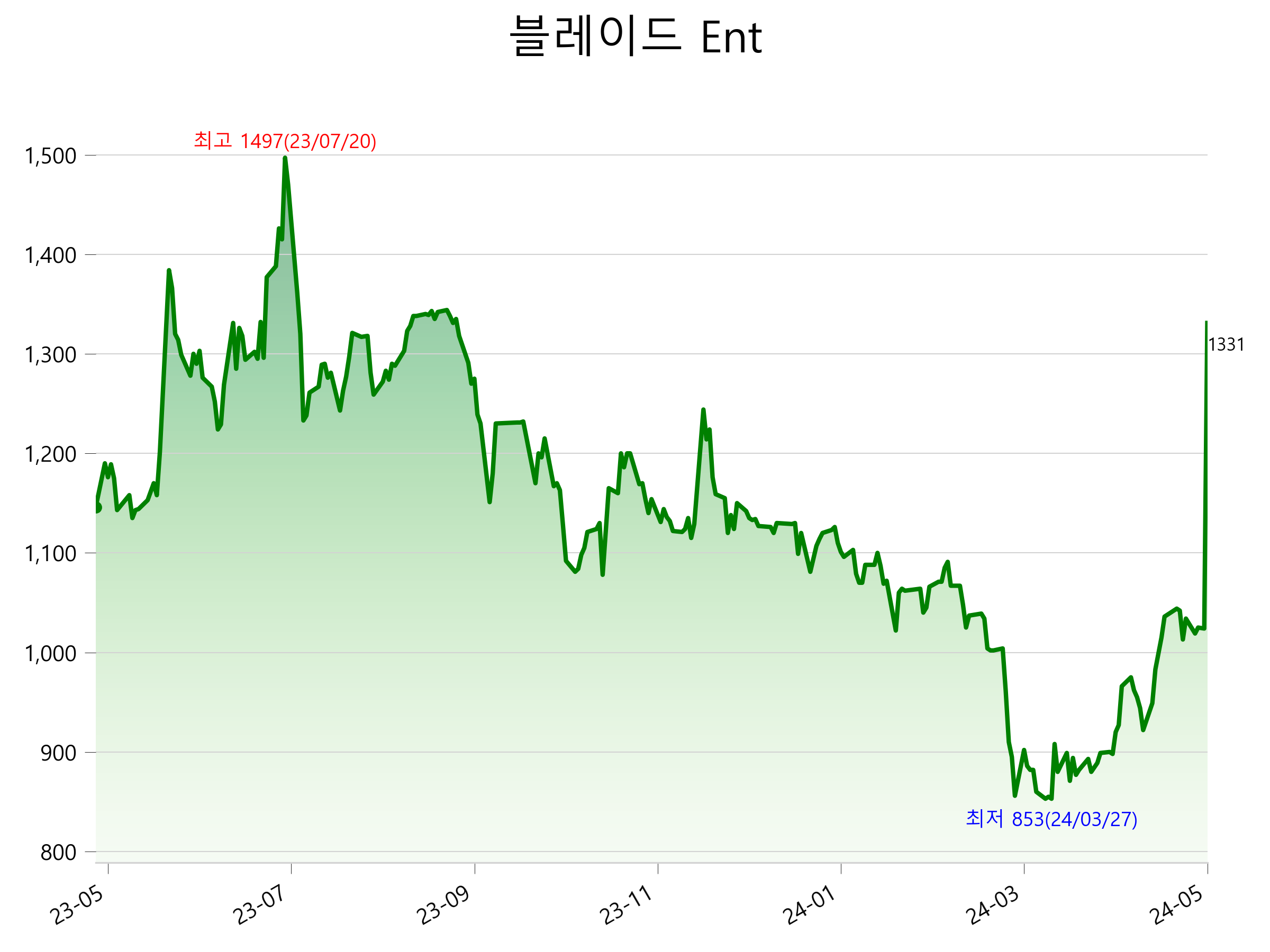 5월 17일 기준 주가는 1,331원 입니다. 아래는 최근 1년간의 주가흐름입니다.