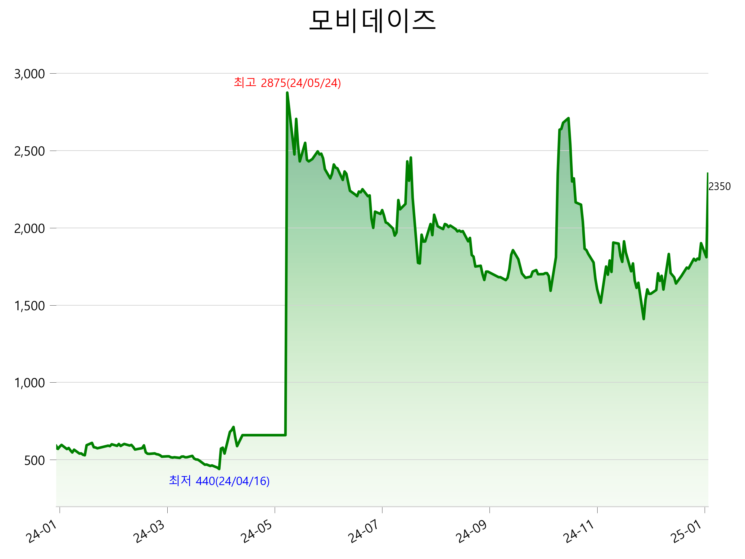 52주 최고가는 2,875원(2024-05-24), 52주 최저가는 440원(2024-04-16)으로 52주간 주가 상승률은 298.3% 입니다.