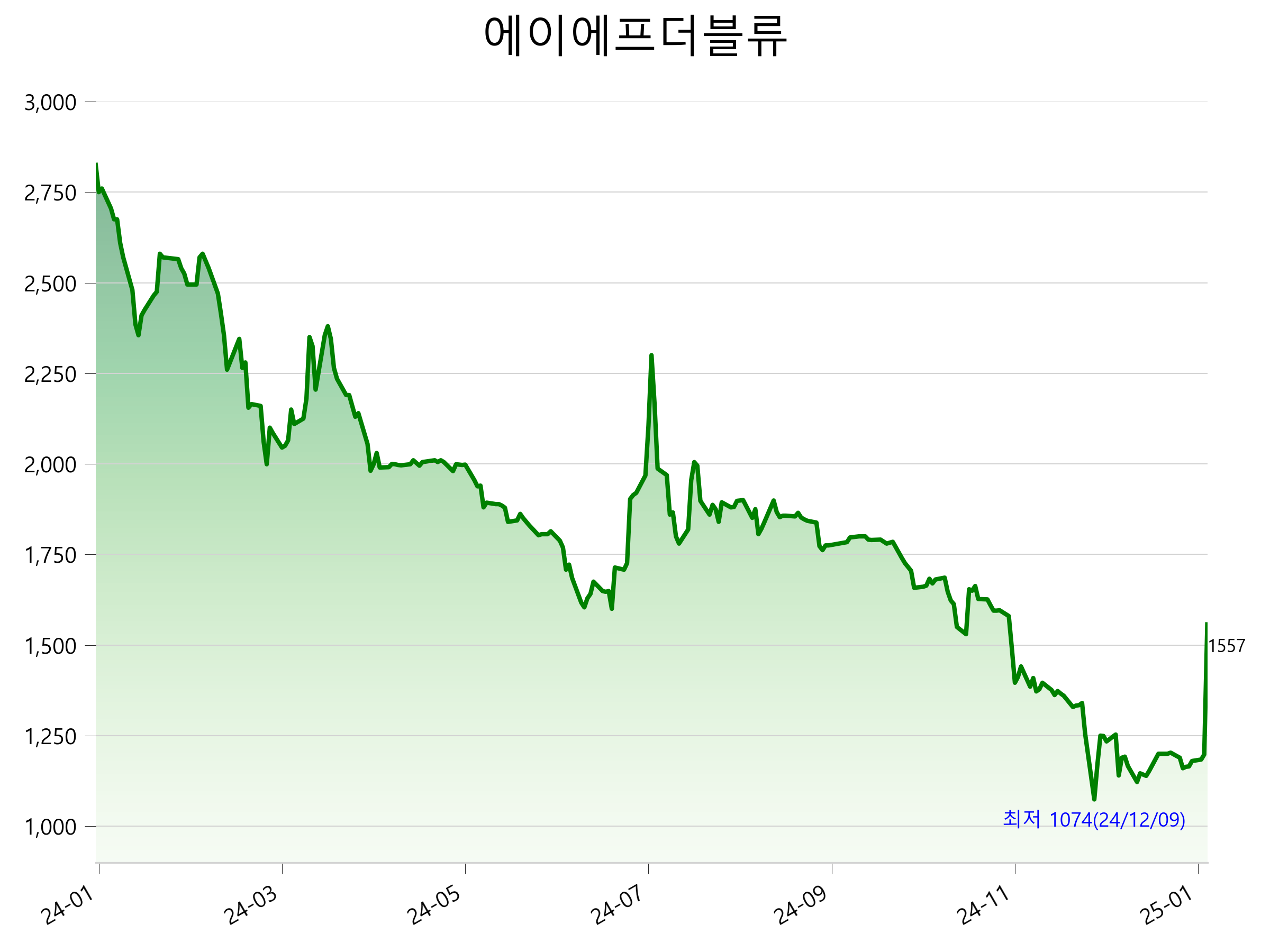 52주 최고가는 2,825원(2024-01-17), 52주 최저가는 1,074원(2024-12-09)으로 52주간 주가 상승률은 -44.9% 입니다.