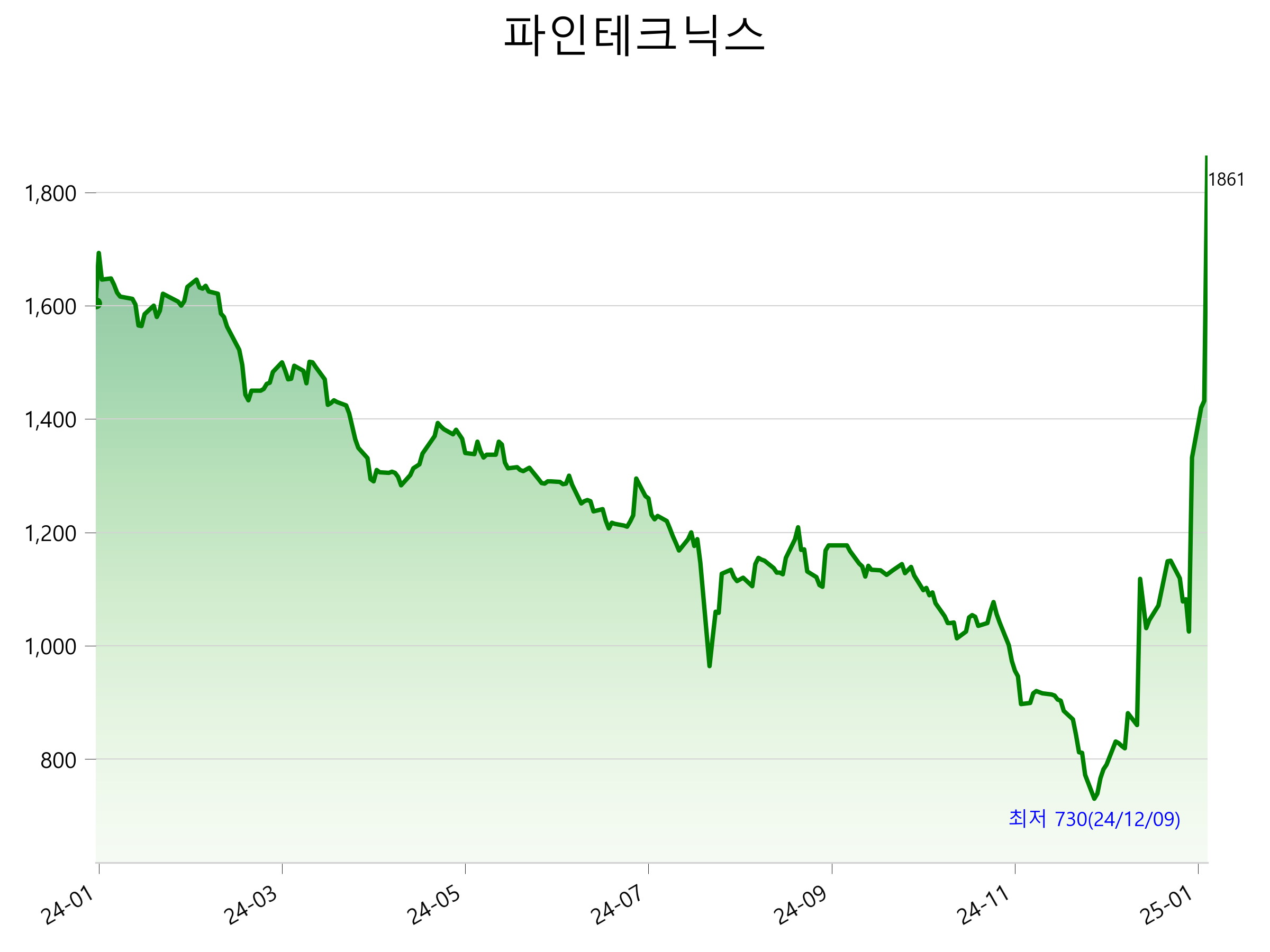52주 최고가는 1,861원(2025-01-15), 52주 최저가는 730원(2024-12-09)으로 52주간 주가 상승률은 16.0% 입니다.