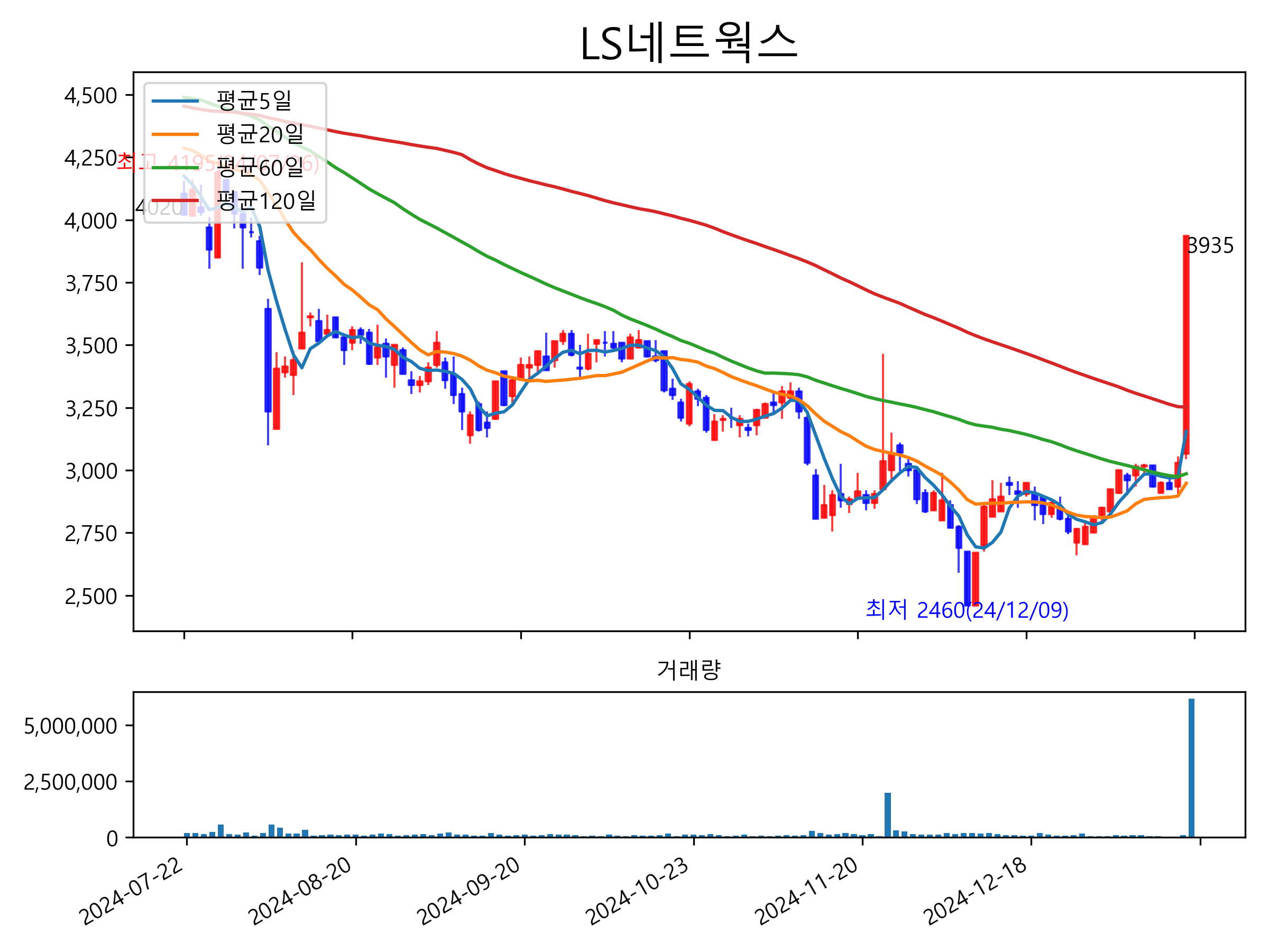 최근 6개월간 캔들차트 및 이동평균선입니다.
