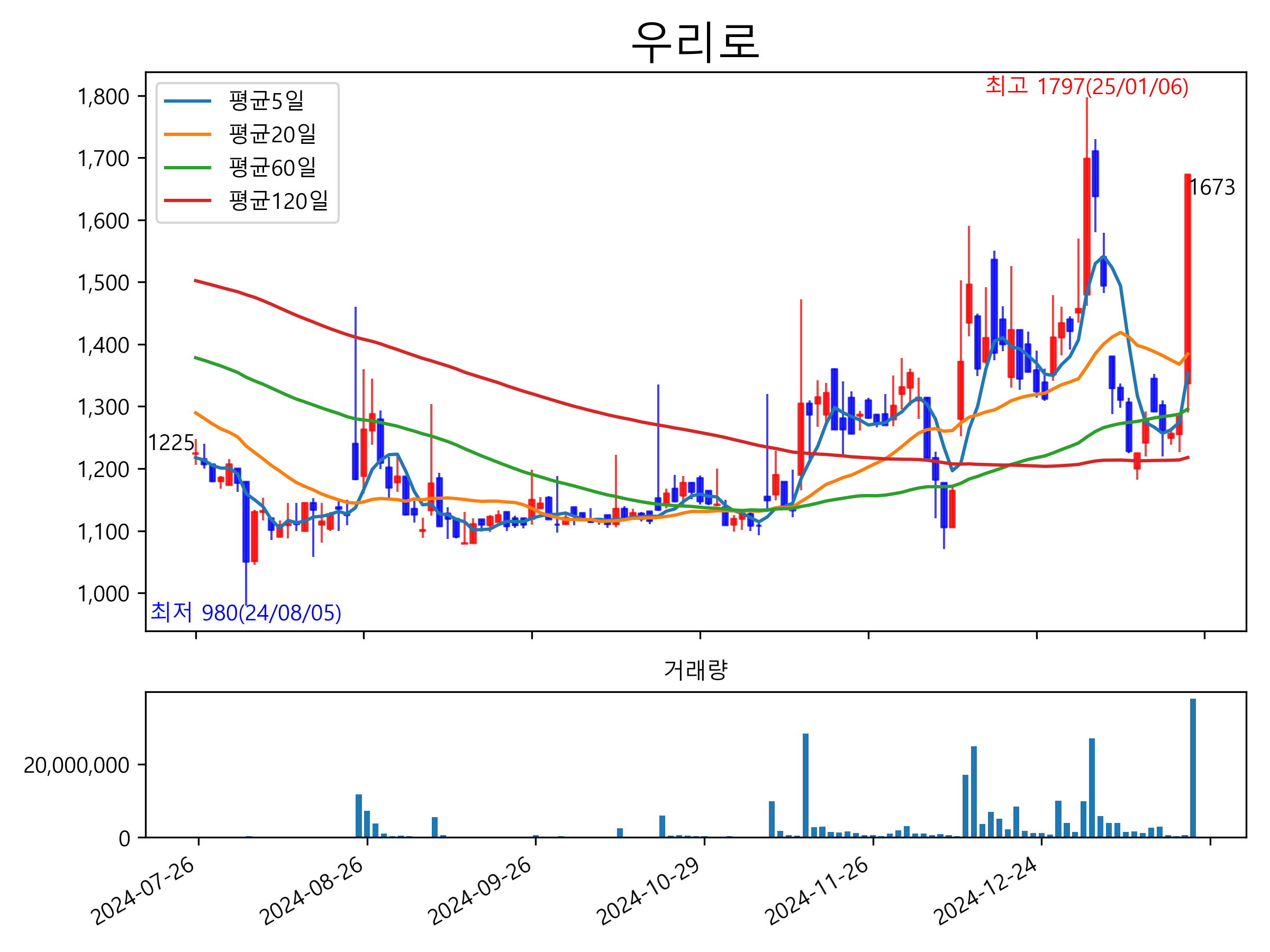최근 6개월간 캔들차트 및 이동평균선입니다.