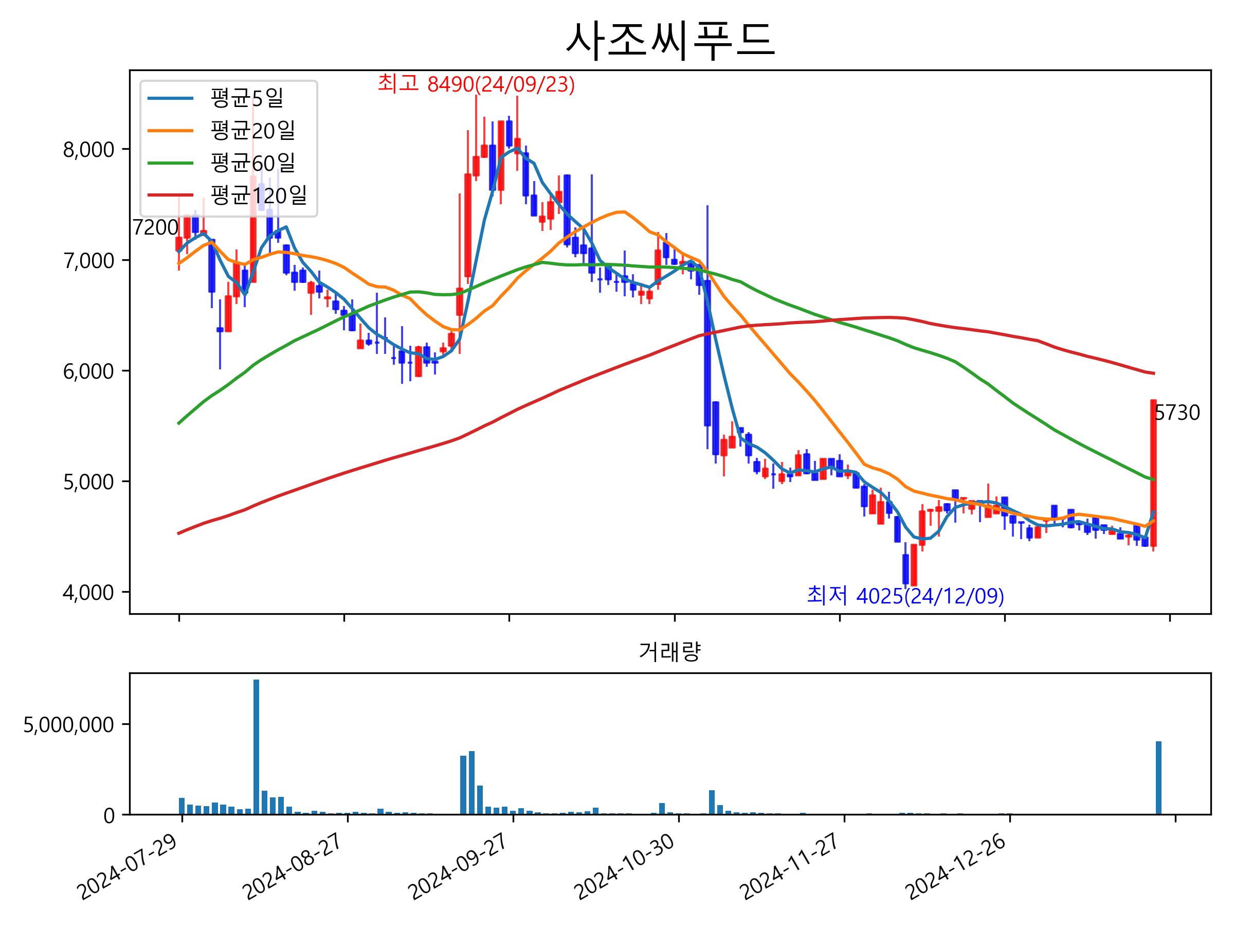 최근 6개월간 캔들차트 및 이동평균선입니다.