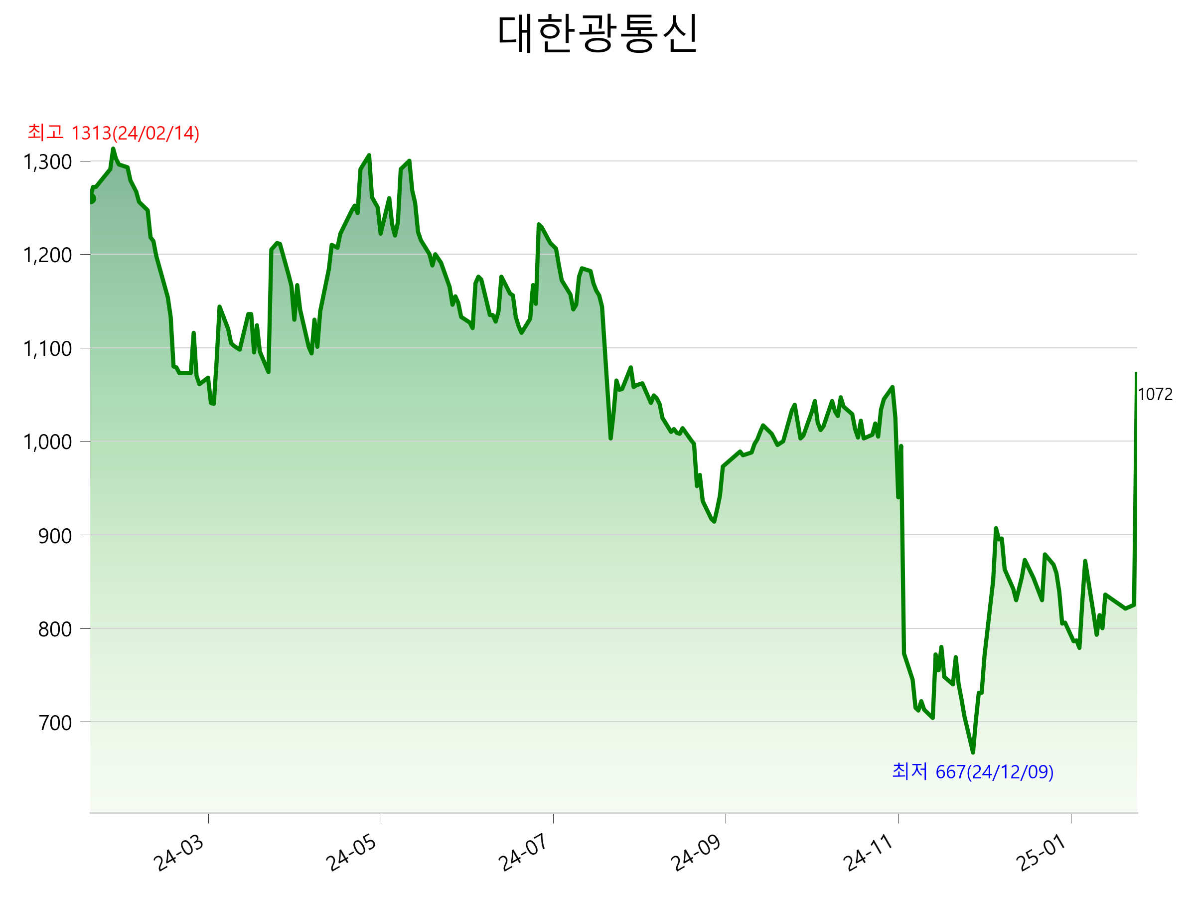 2월 4일 기준 주가는 1,072원 입니다. 아래는 최근 1년간의 주가흐름입니다.