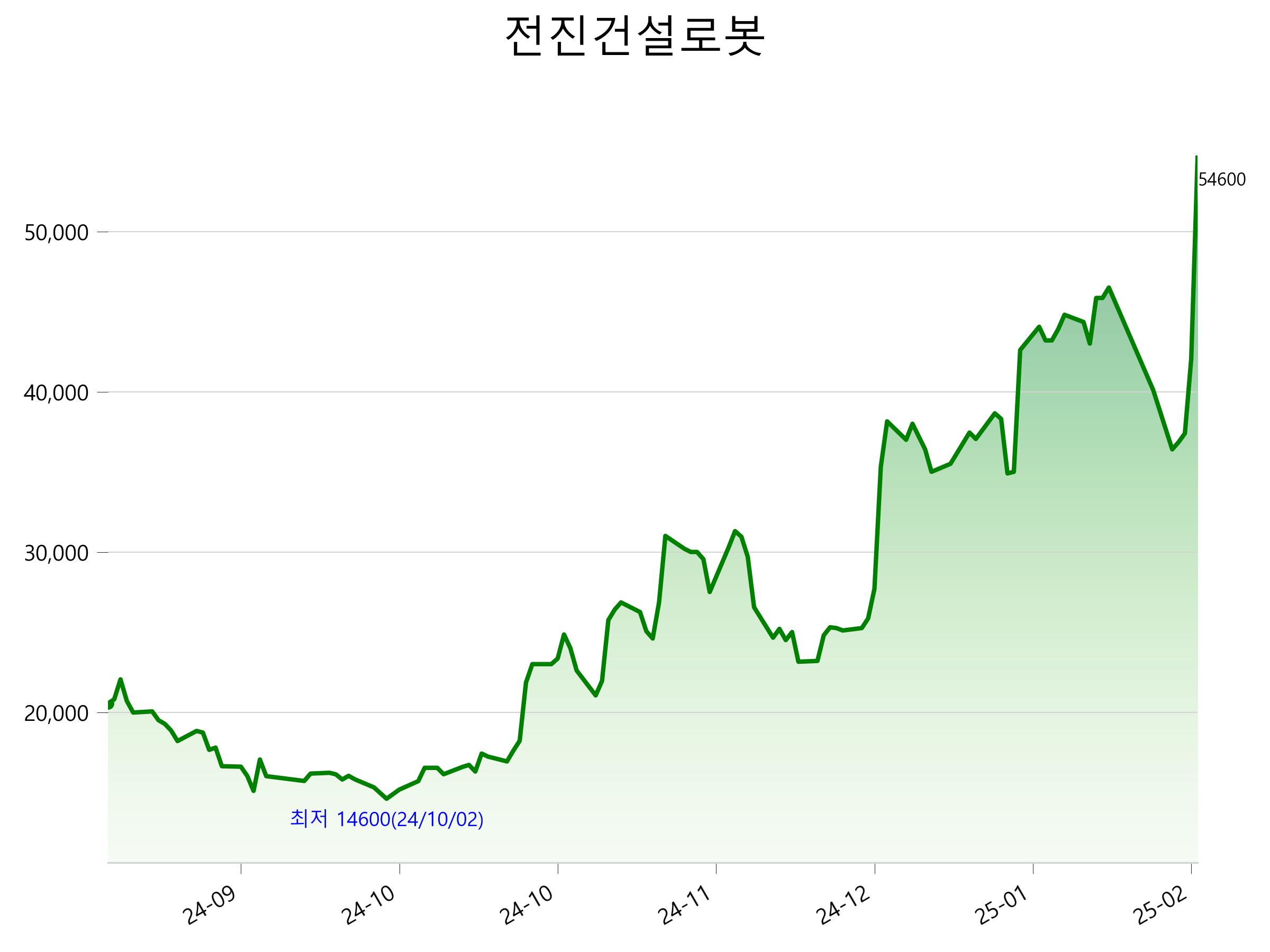 52주 최고가는 54,600원(2025-02-07), 52주 최저가는 14,600원(2024-10-02)으로 52주간 주가 상승률은 165.7% 입니다.