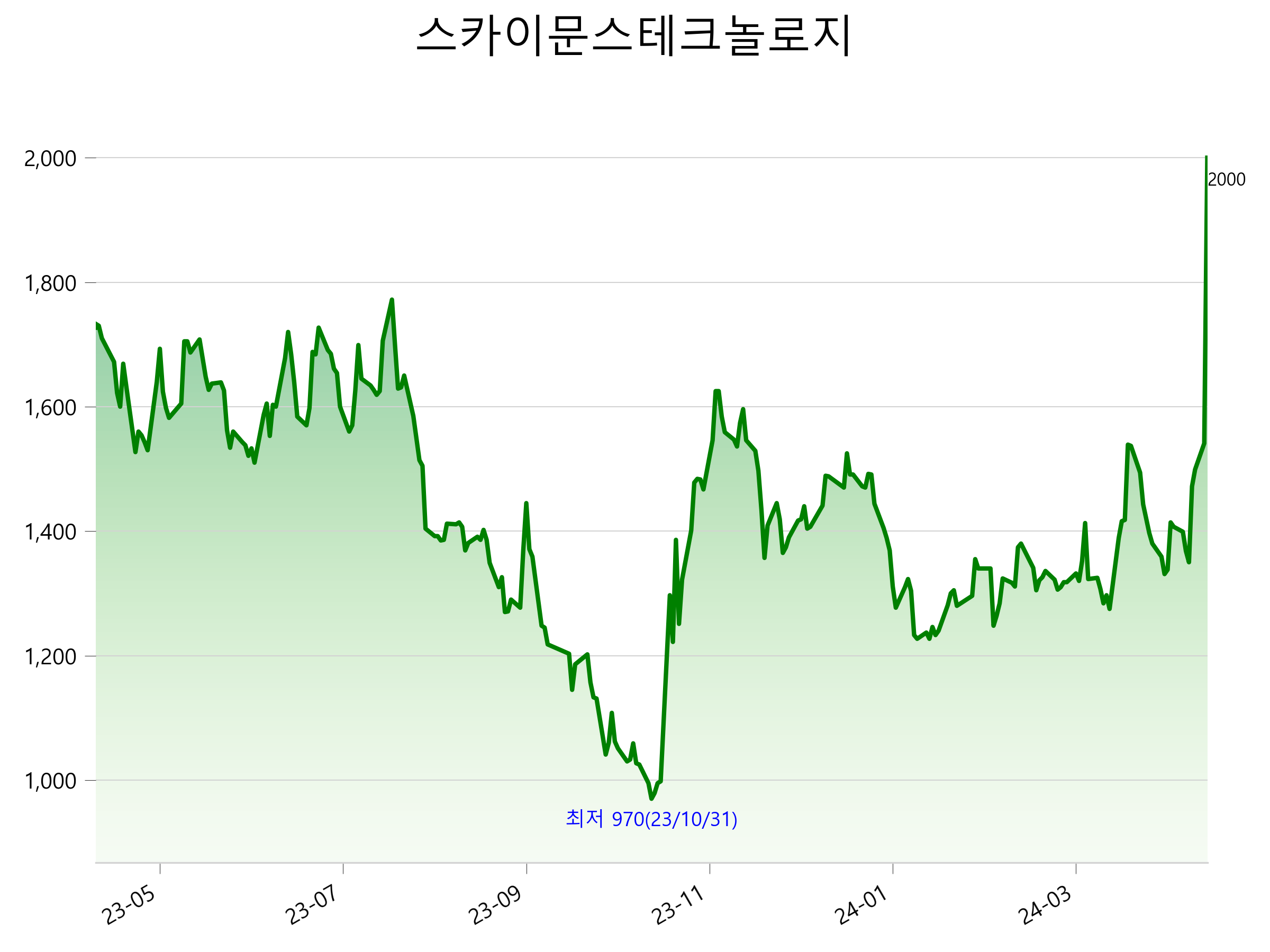 52주 최고가는 2,000원(2024-04-30), 52주 최저가는 970원(2023-10-31)으로 52주간 주가 상승률은 15.4% 입니다.