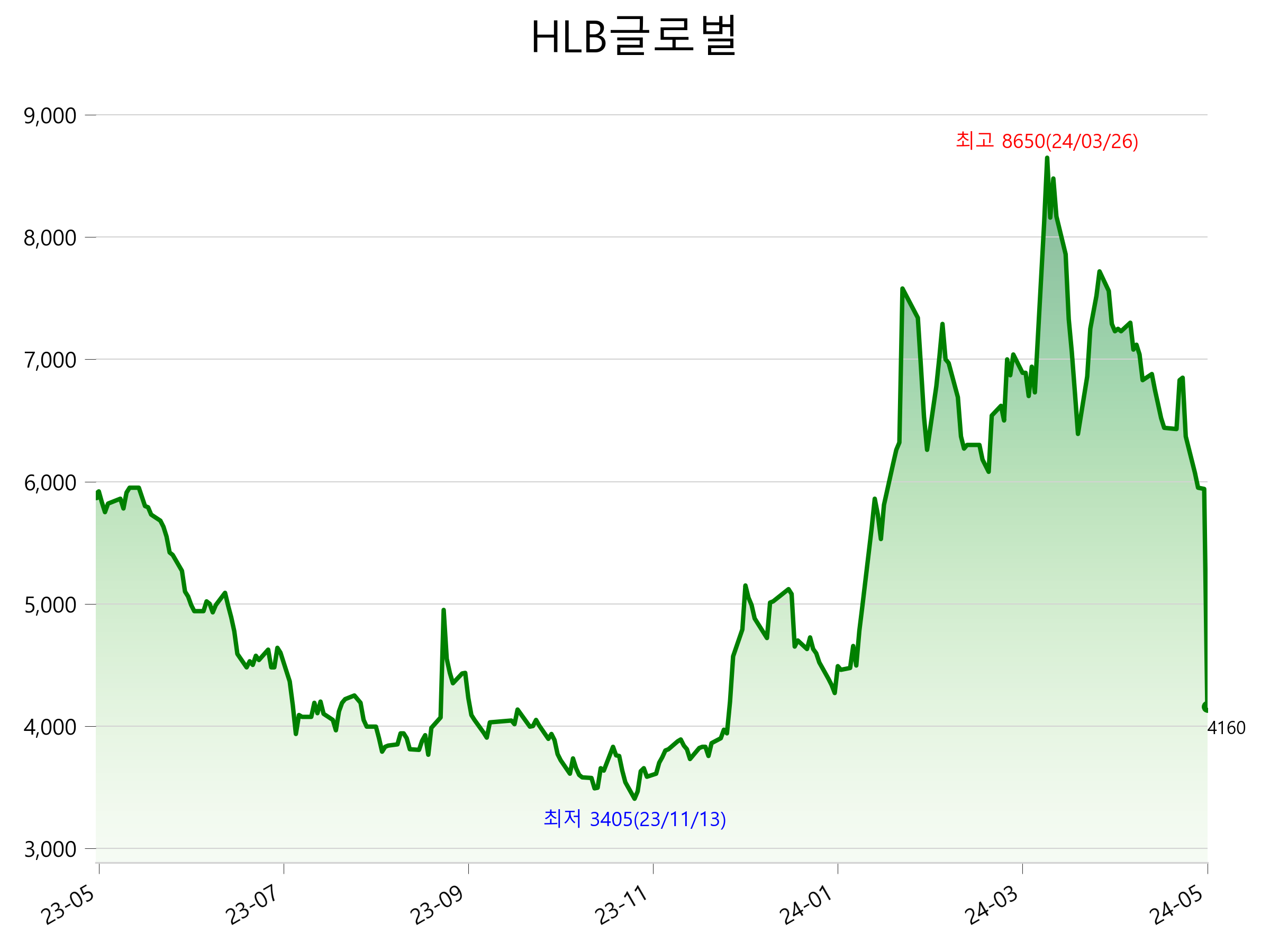 5월 18일 기준 주가는 4,160원 입니다. 아래는 최근 1년간의 주가흐름입니다.