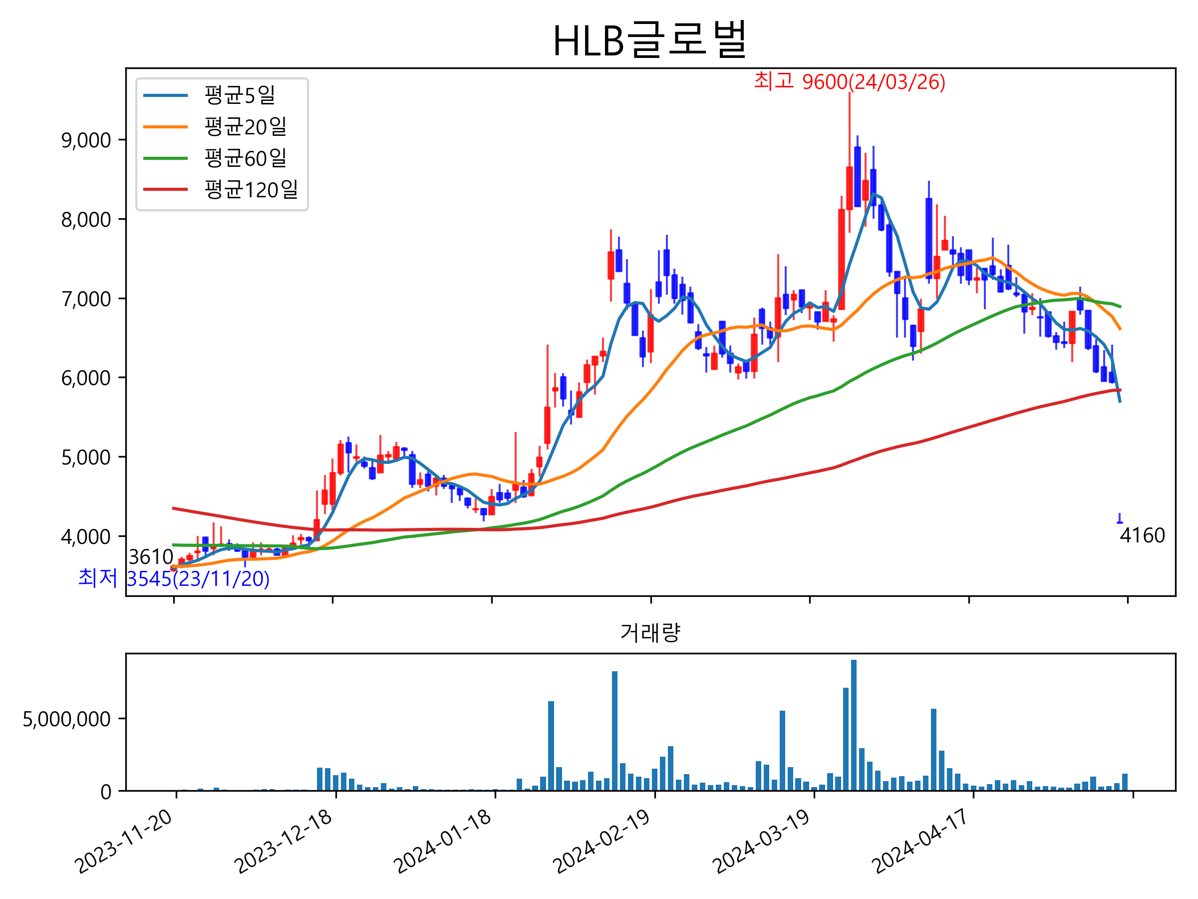 최근 6개월간 캔들차트 및 이동평균선입니다.