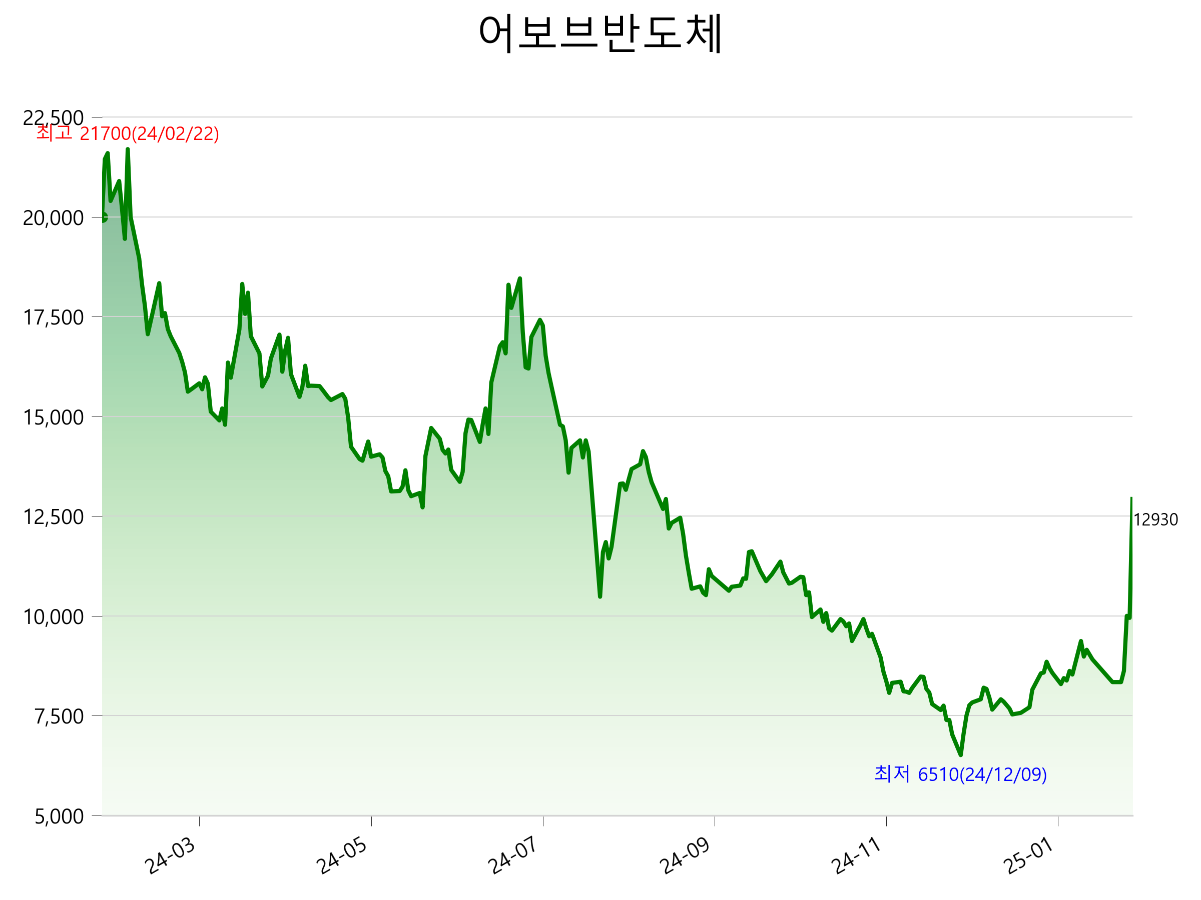 2월 7일 기준 주가는 12,930원 입니다. 아래는 최근 1년간의 주가흐름입니다.
