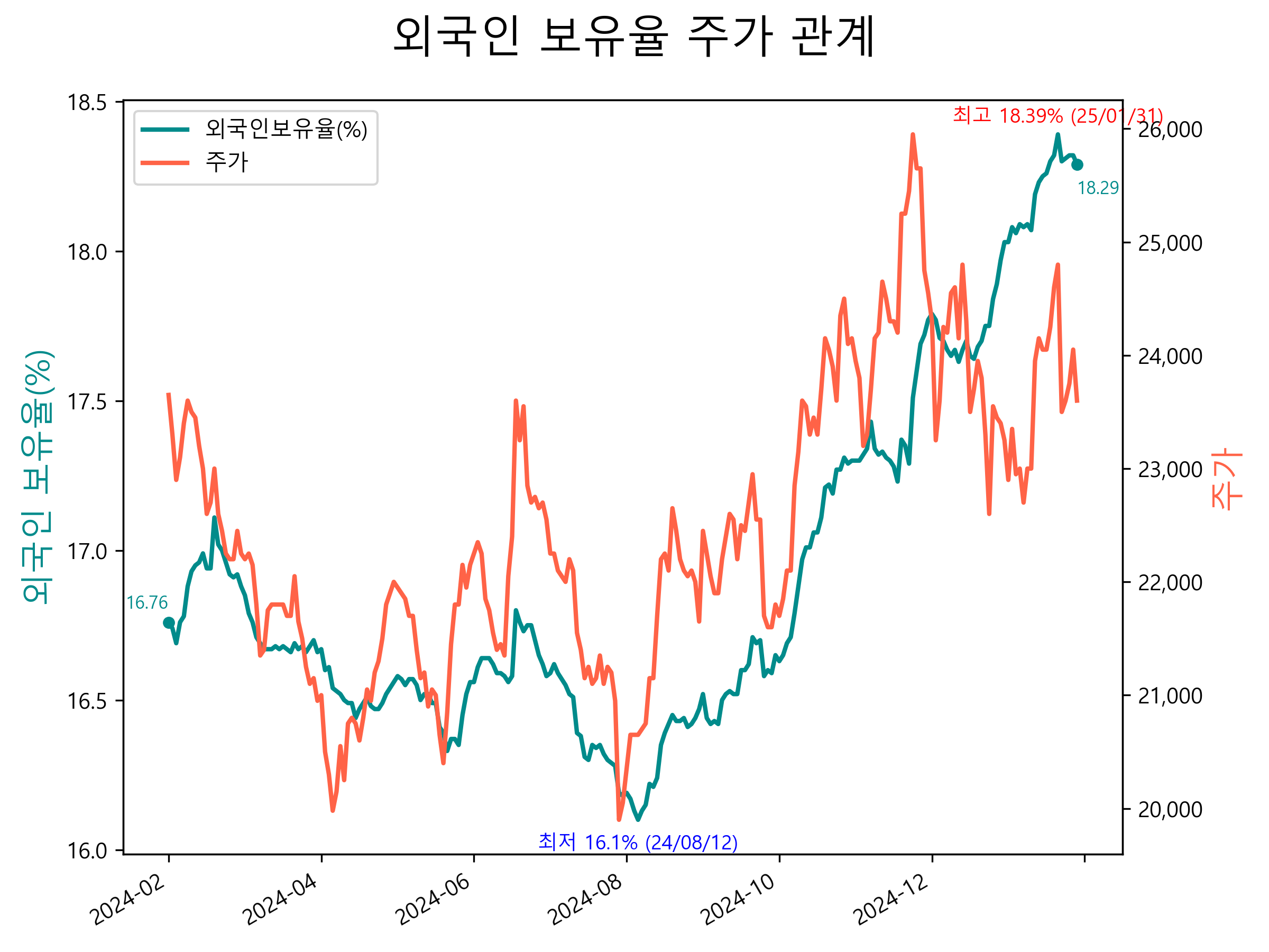 최근 1년간 외국인 보유율 및 주가와의 관계입니다.