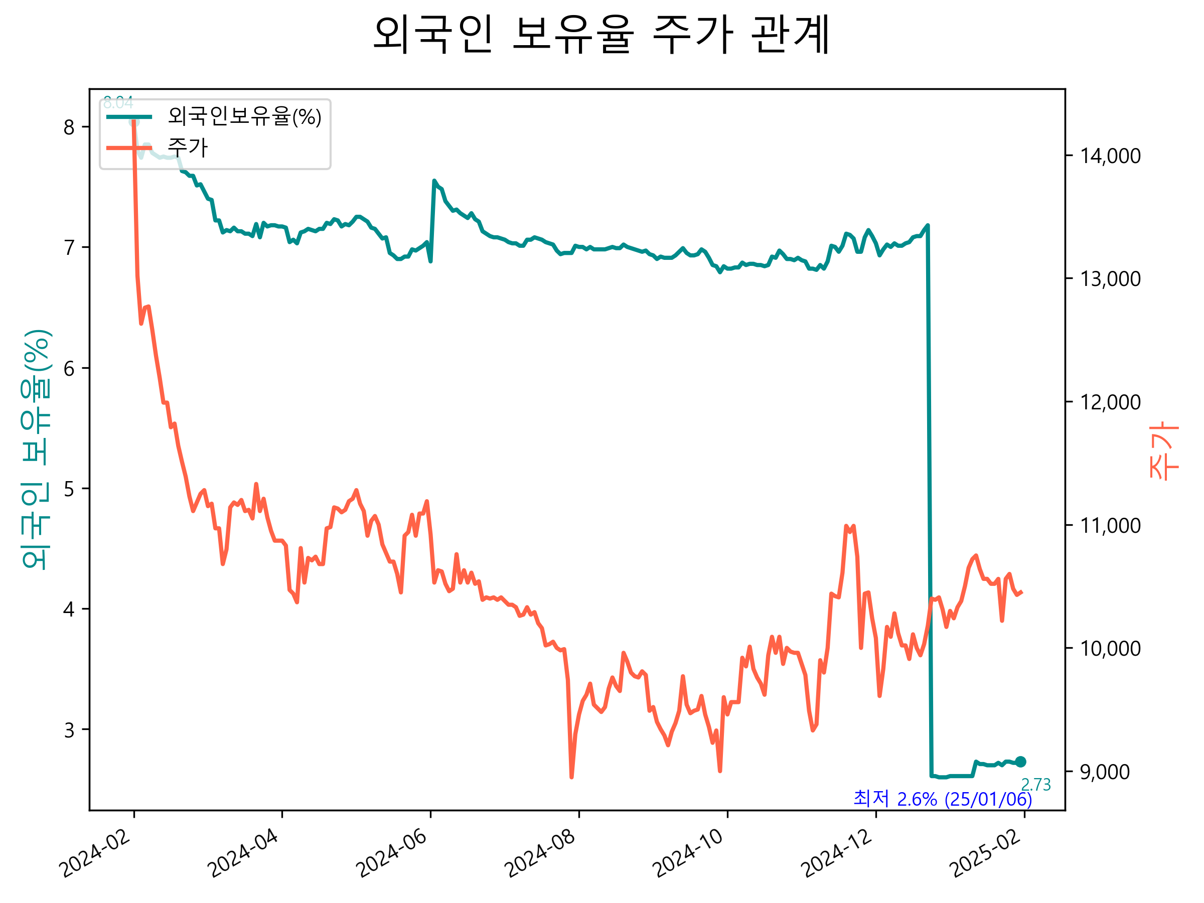 최근 1년간 외국인 보유율 및 주가와의 관계입니다.
