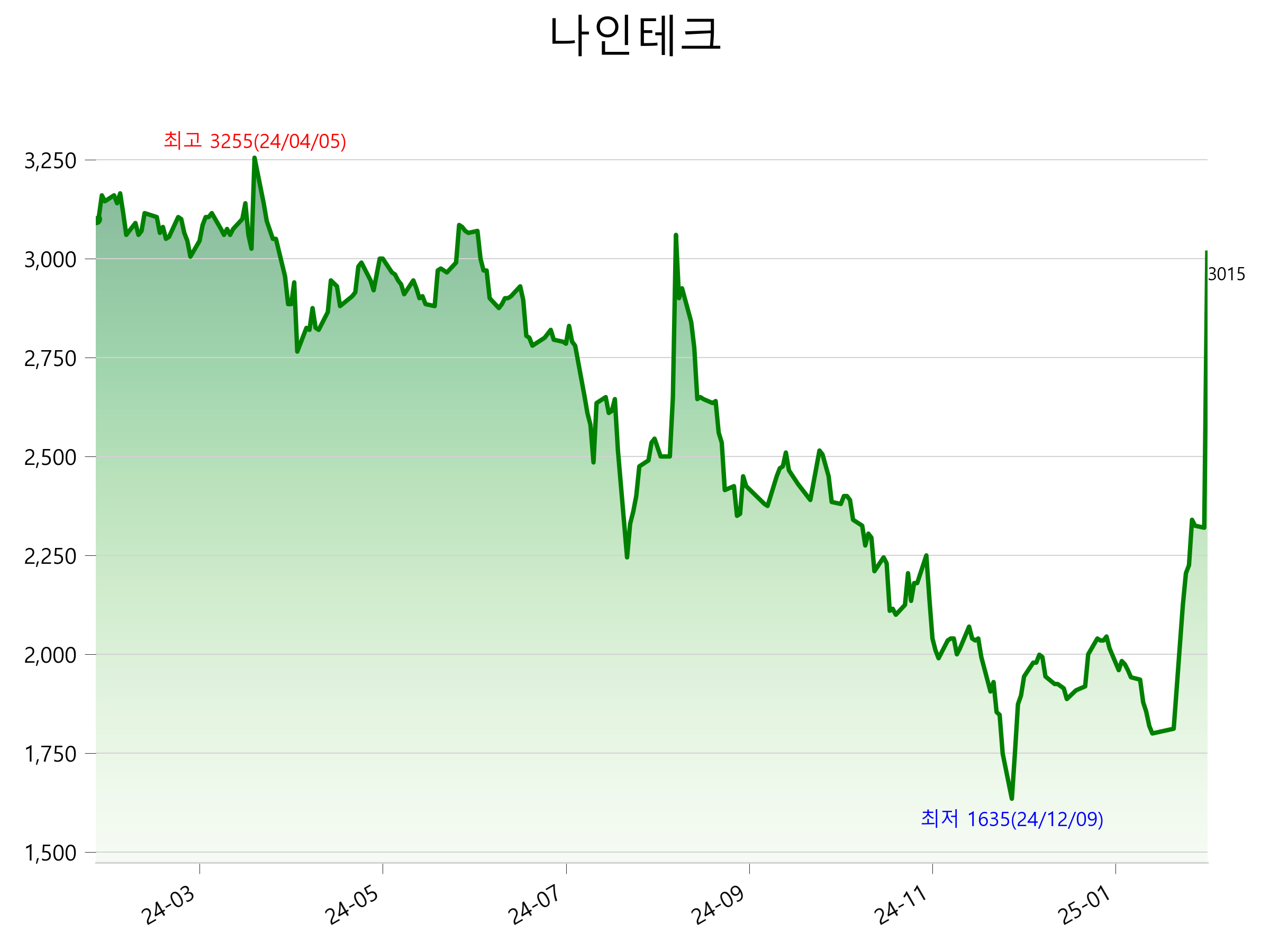 나인테크(267320)의 2월 11일 주가가 급상승했습니다. 나인테크에 대해 어떠한 기업이며, 주식정보 및 주가 상한가 이유에 대해서 알려드리겠습니다.