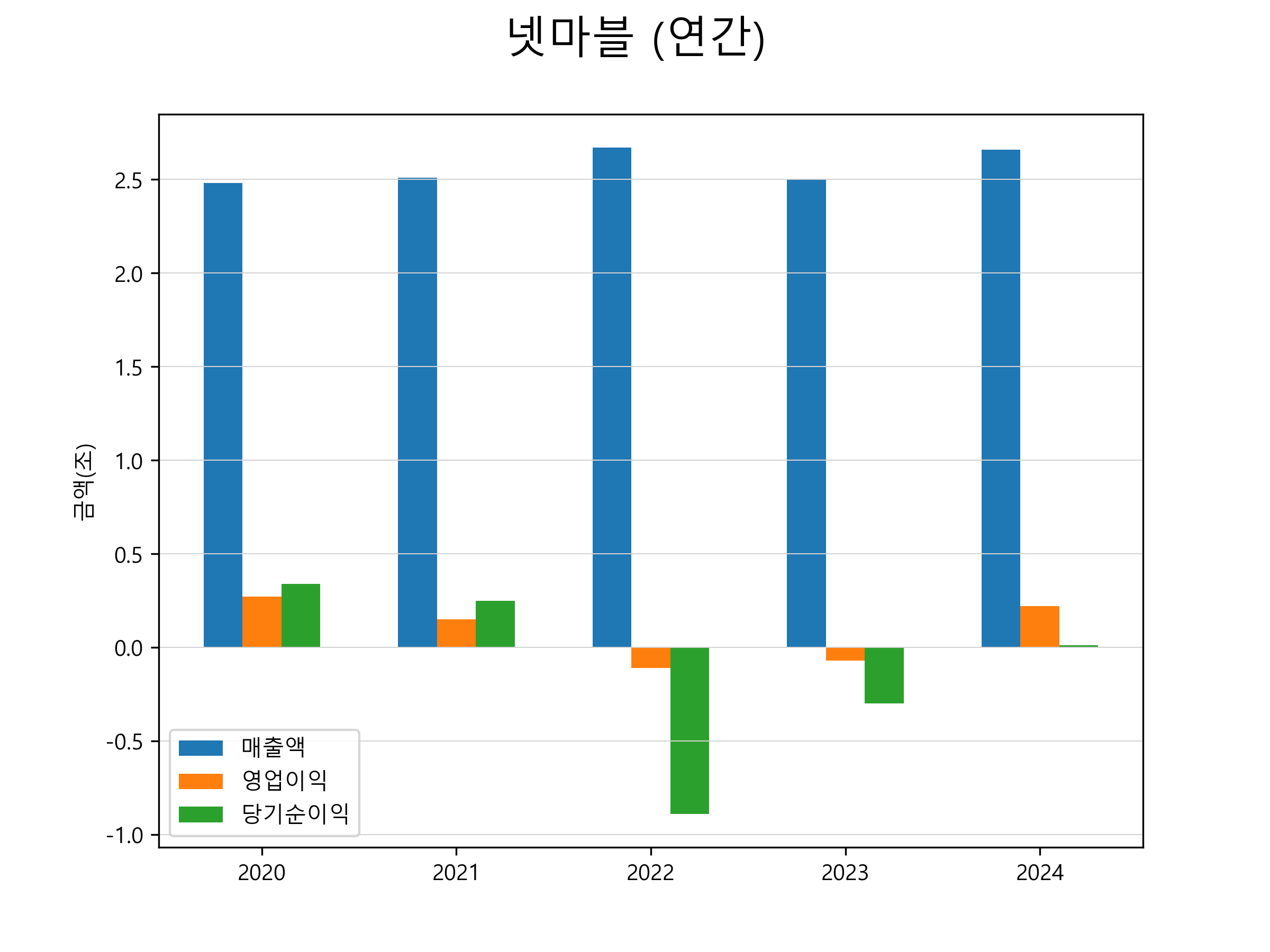 넷마블의 최근 5년간 실적입니다. 2024년 매출은 2조 6638억원, 영업이익 2156억원, 당기순이익 63억원을 기록했습니다. 연간 매출 및 영업이익, 당기순이익 표입니다.