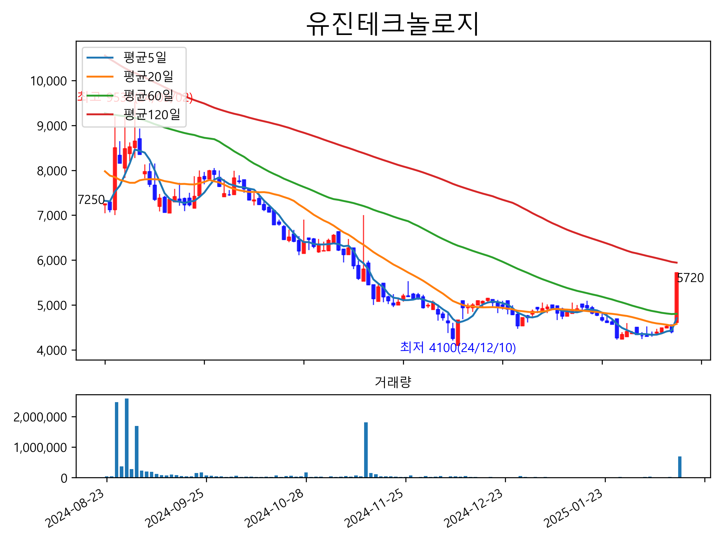 최근 6개월간 캔들차트 및 이동평균선입니다.
