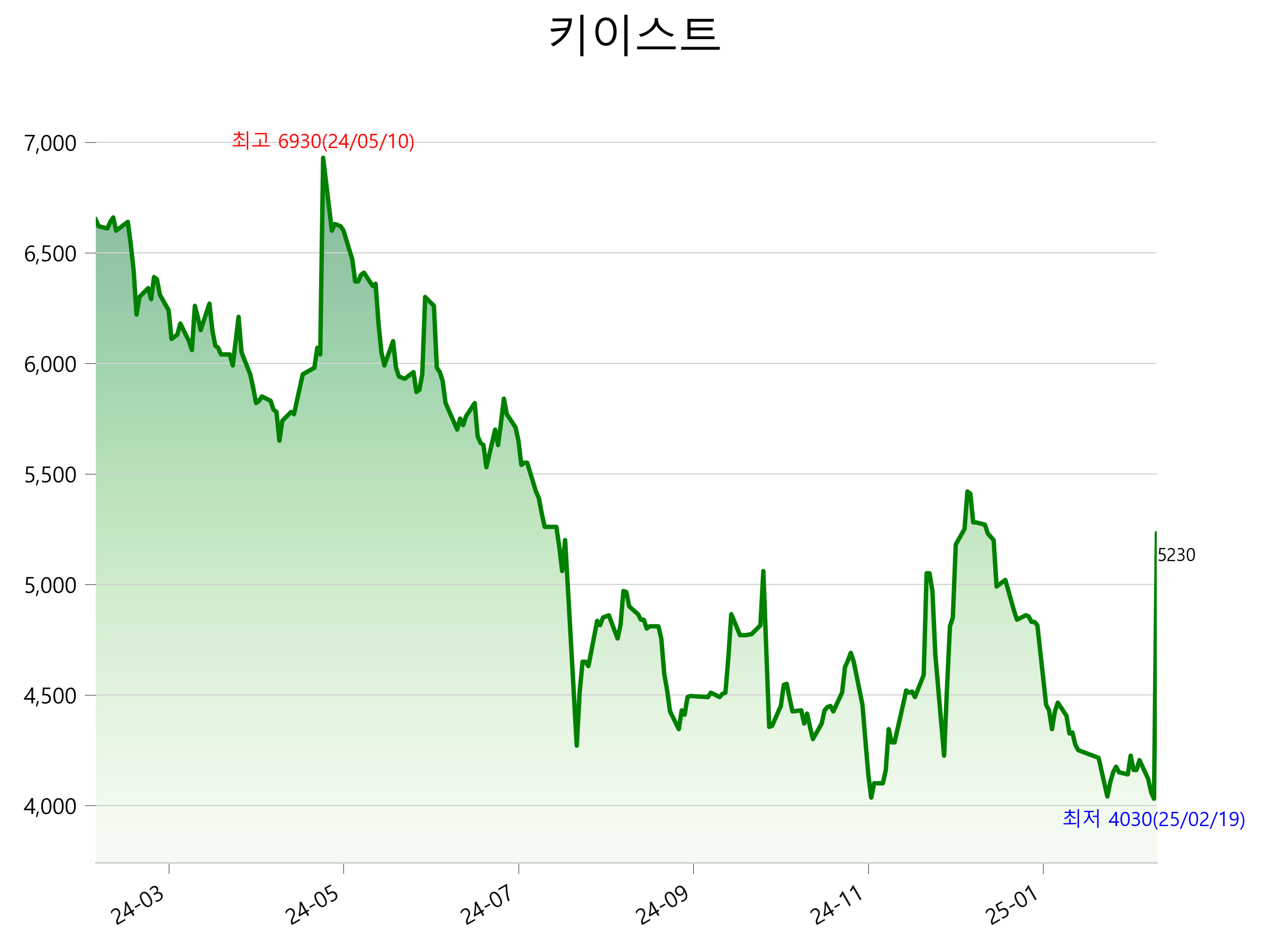52주 최고가는 6,930원(2024-05-10), 52주 최저가는 4,030원(2025-02-19)으로 52주간 주가 상승률은 -21.4% 입니다.