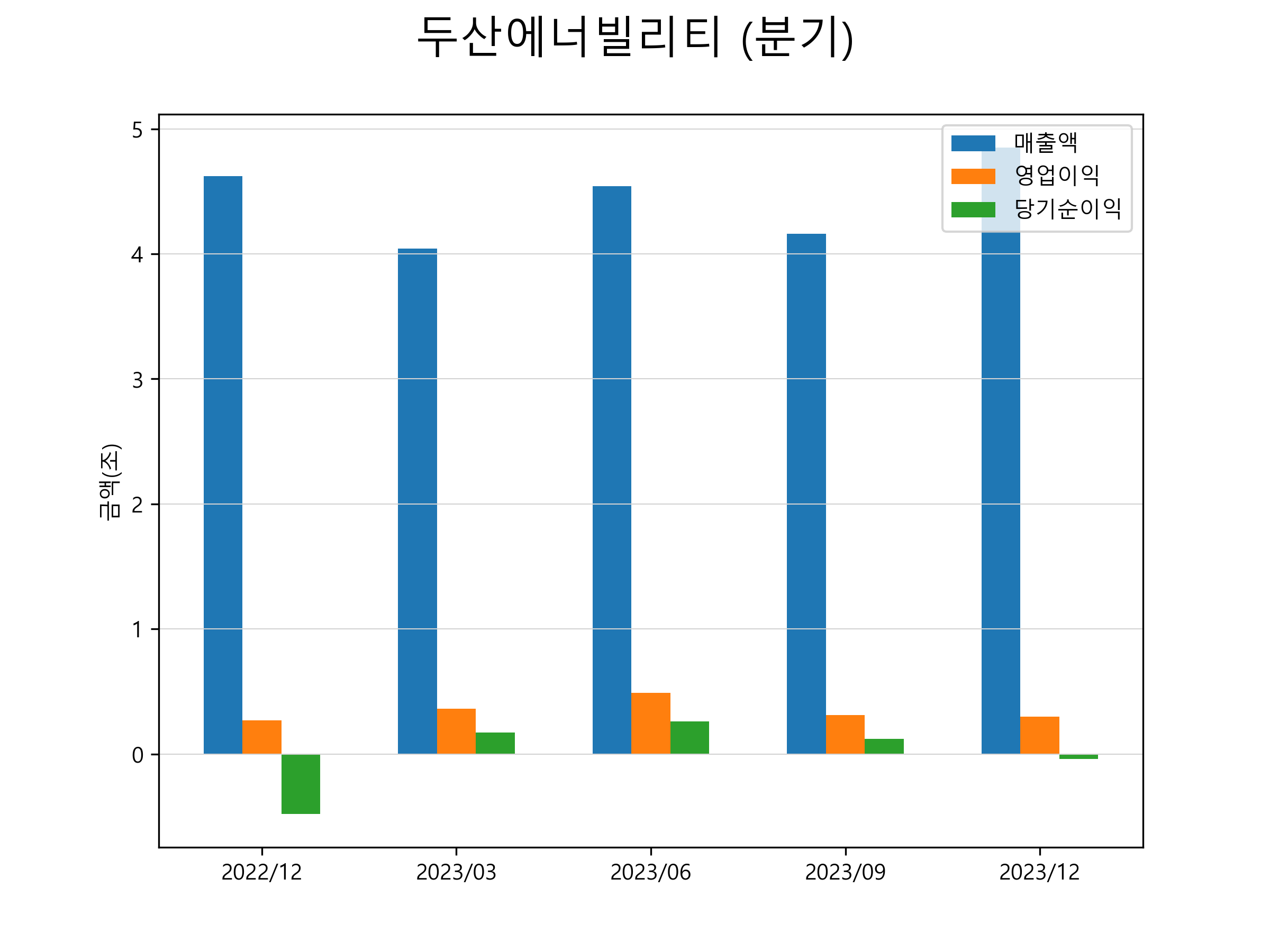 두산에너빌리티의 2023년 4분기 매출은 4조 8545억원, 영업이익 2967억원, 당기순손실 -363억원을 기록했습니다. 분기별 매출 및 영업이익, 당기순이익 표입니다.